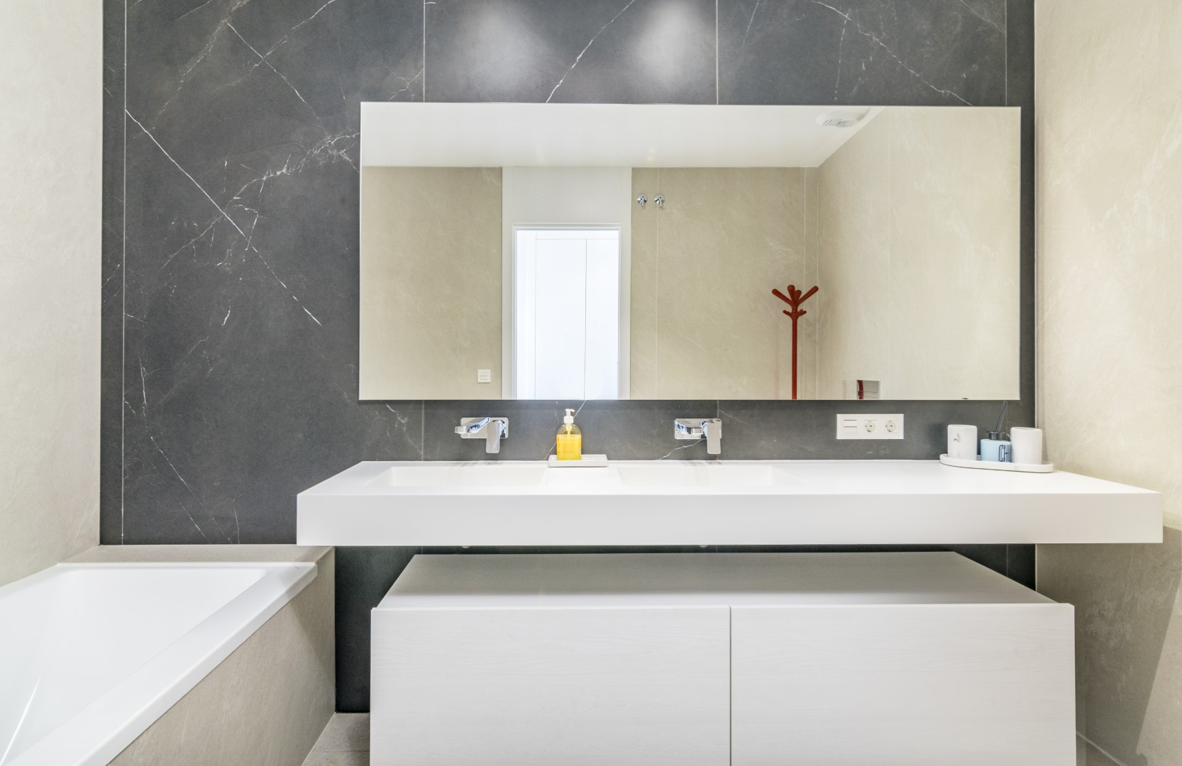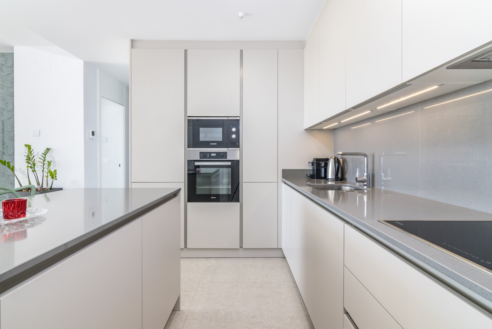 Das Layout ist wie folgt. Wenn Sie die Wohnung betreten, sehen Sie auf der rechten Seite die moderne, offene Küche. Auf der linken Seite befindet sich der offene, stilvolle Wohn- und Essbereich. Direkter Zugang zu einer fantastischen Terrasse mit Loungebereich und Essbereich. Von dieser Terrasse aus hat man einen unschlagbaren Blick auf das Meer und das Tal. Geradeaus geht es zu den beiden Schlafzimmern, das erste mit separatem Bad und zwei Einzelbetten. Das Hauptschlafzimmer hat zwei extra lange Einzelbetten und ein eigenes Bad.