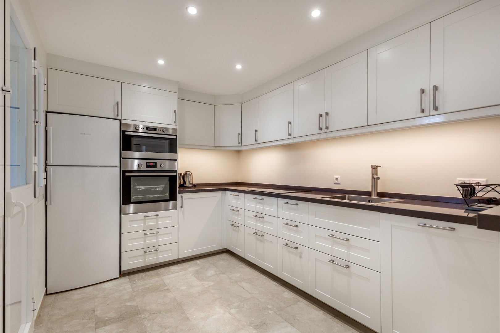 Eingang, auf der rechten Seite befindet sich das Gästeschlafzimmer mit 2 Einzelbetten und ein separates Badezimmer, dann auf der rechten Seite befindet sich ein kombinierter Wohn- und Essbereich für 6 Personen. Zugang zum Terrassenbereich mit Essplatz für 6 Personen, Gasgrill und Gemeinschaftsgarten. Offene Küche mit separatem Waschbereich mit Waschmaschine und Trockner.