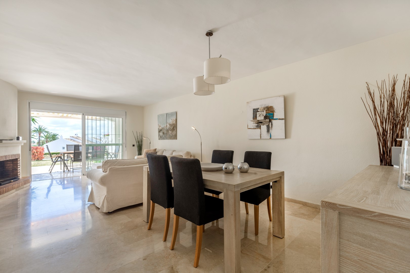 Kombiniertes Wohn- und Esszimmer mit bequemem Sofa und TV-Bereich, der auf die Terrasse führt.