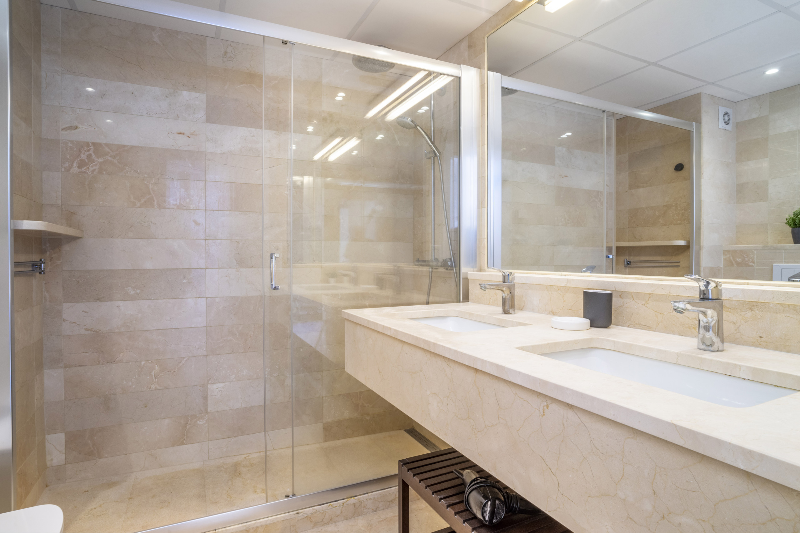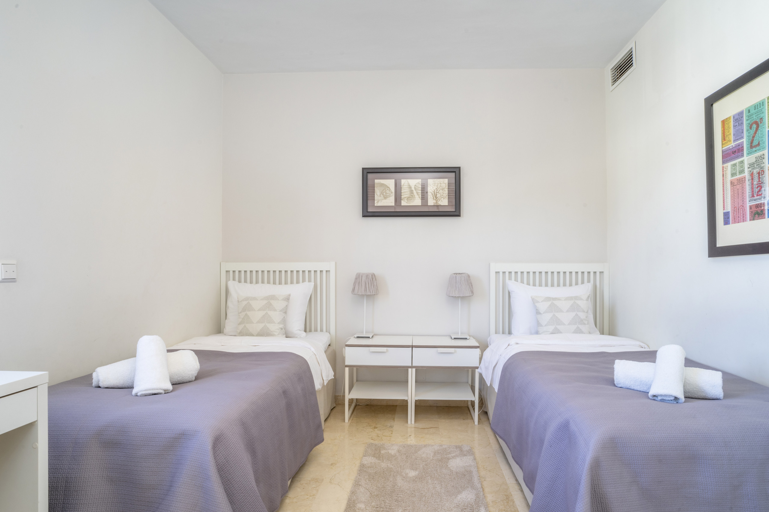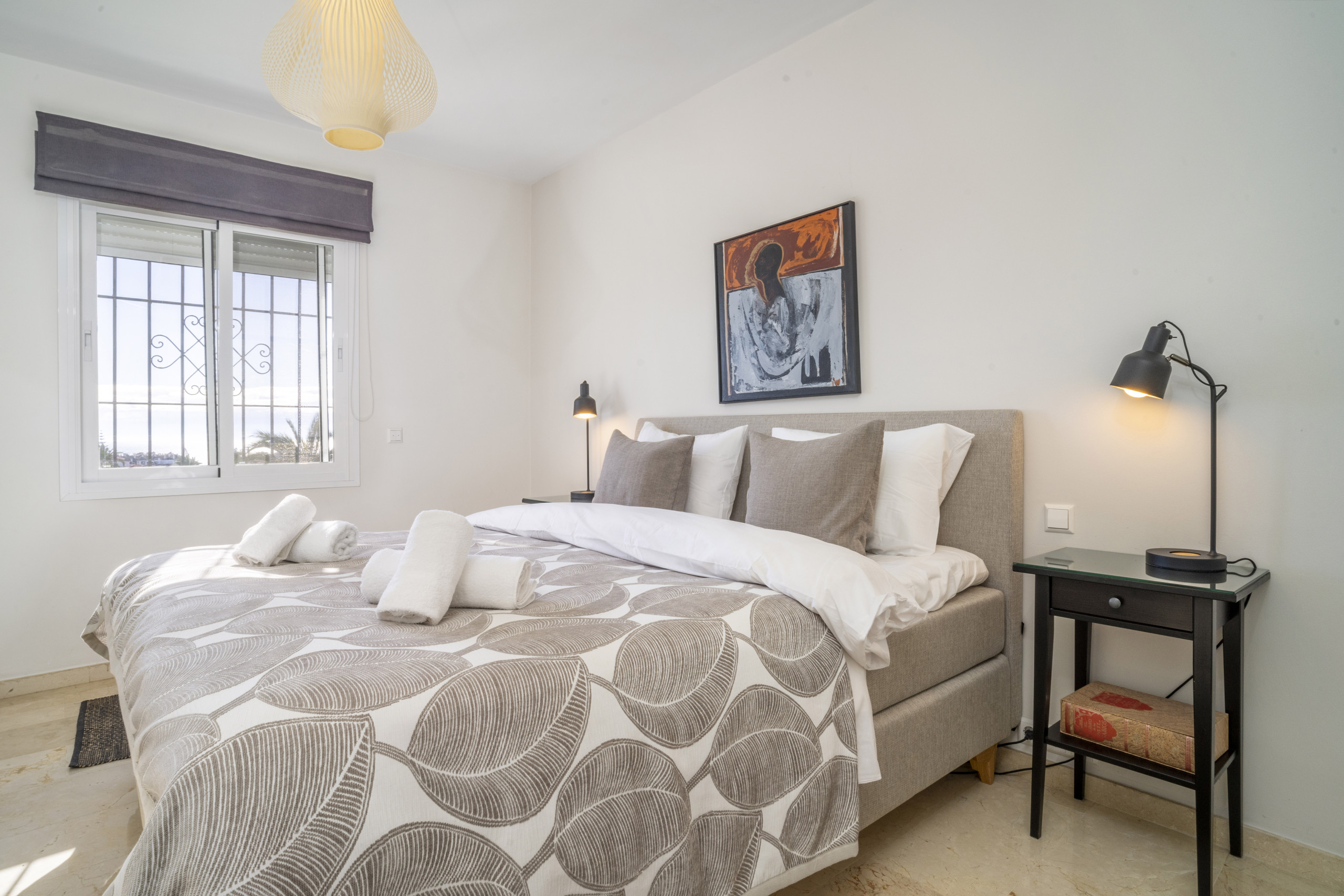 Das Hauptschlafzimmer verfügt über ein eigenes Badezimmer und befindet sich praktischerweise neben dem Wohnzimmer. Ein zweites Doppelzimmer mit Zwillingsbetten befindet sich in der Nähe des Eingangs, zusammen mit einem zweiten Badezimmer, das Waschmaschine und Wäschetrockner enthält.