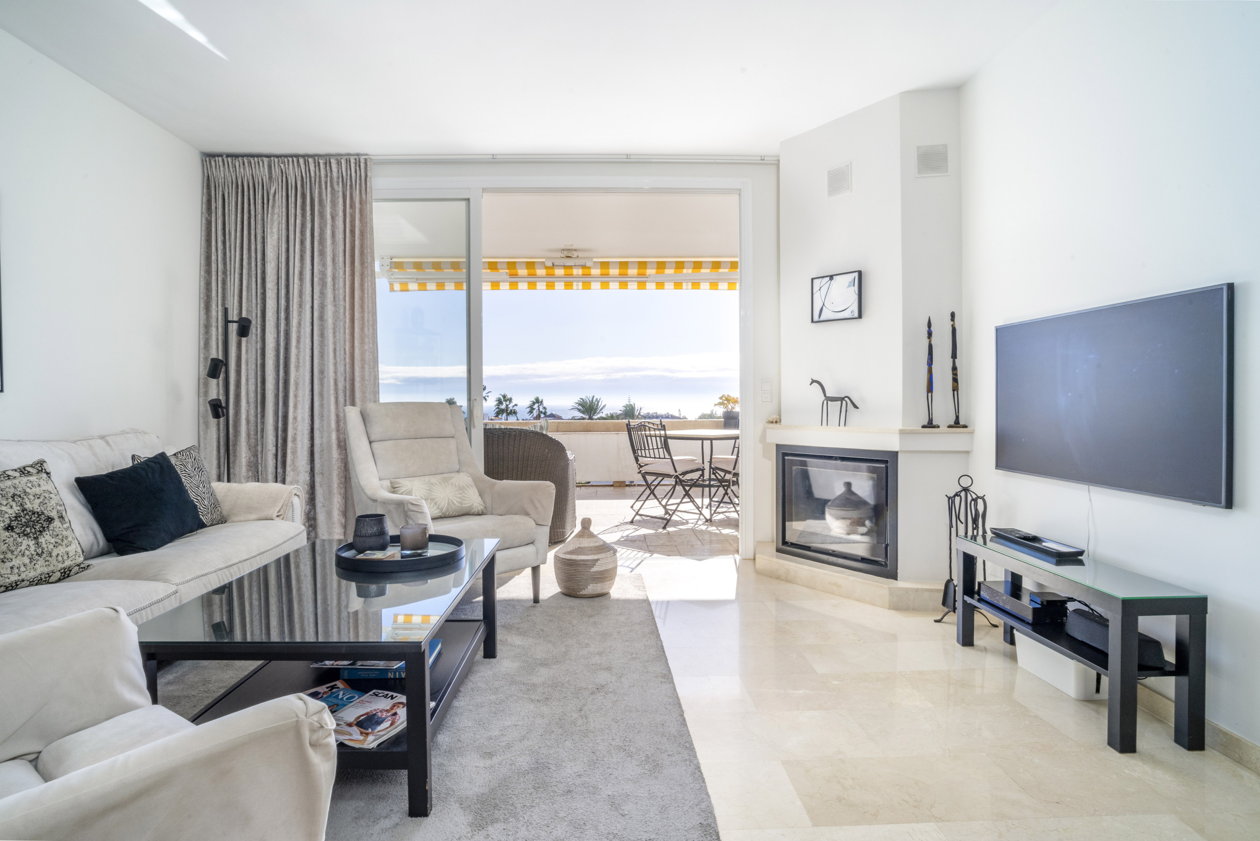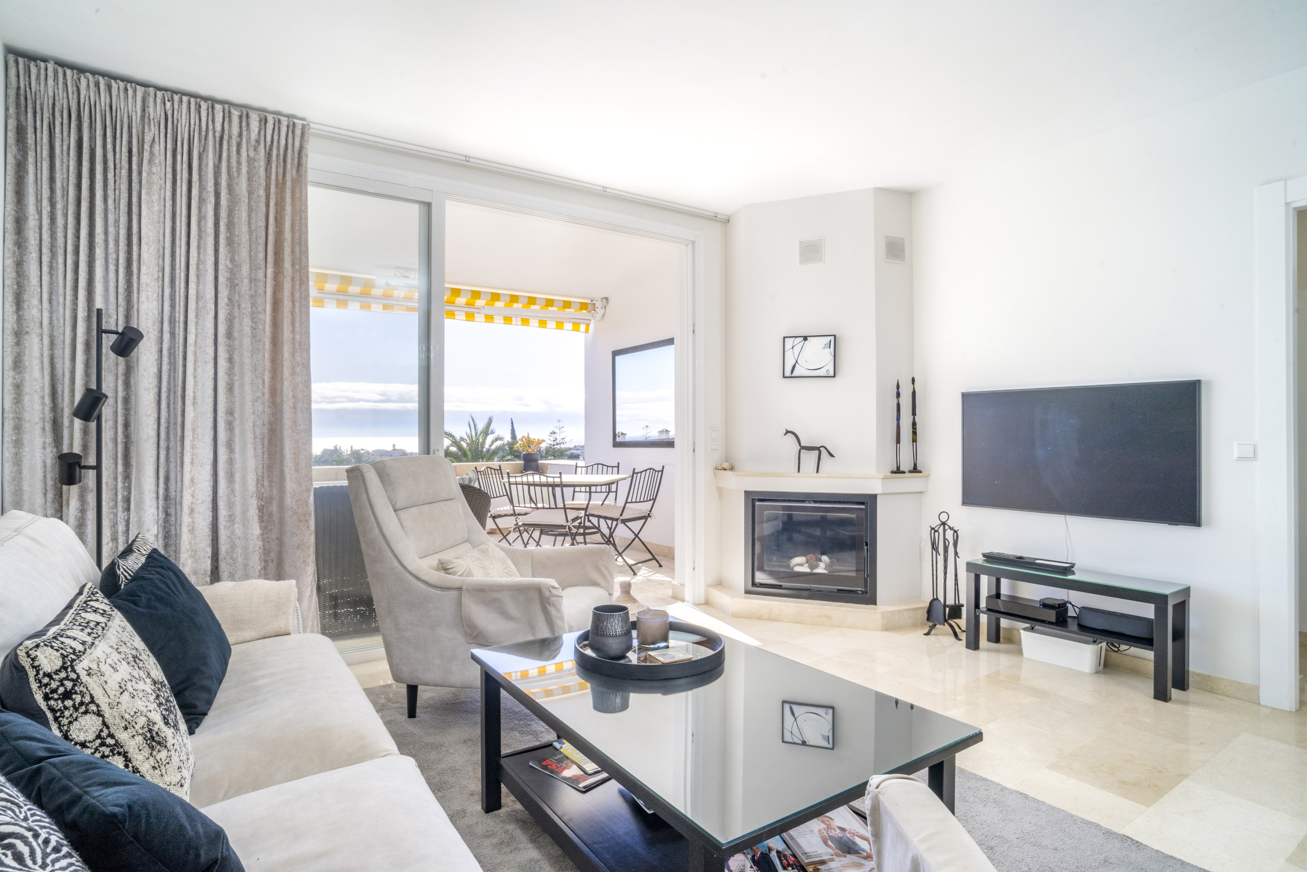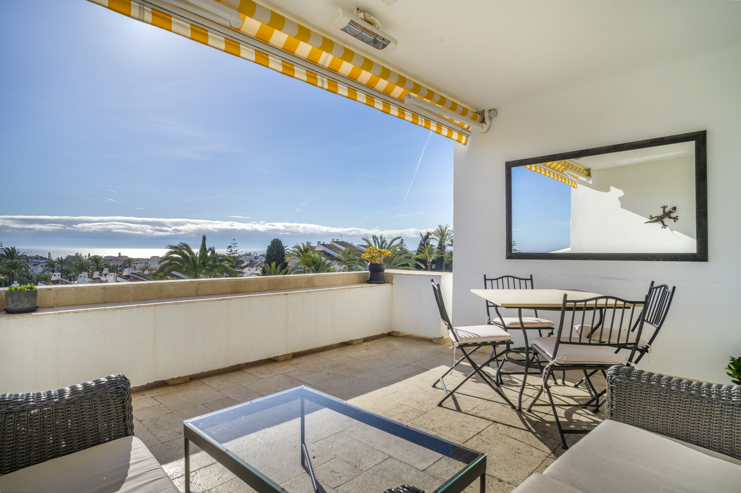 Die Wohnung ist ideal für einen komfortablen und entspannten Aufenthalt in Nueva Andalucia. Die offene Grundrissgestaltung umfasst einen kombinierten Wohn- und Essbereich, der nahtlos in eine vollständig ausgestattete Küche mit Frühstückstheke übergeht. Das Wohnzimmer führt auf eine wunderbare Terrasse mit Liege- und Essbereich, von wo aus Sie dank der erhöhten Lage atemberaubende Meer- und Bergblicke genießen können.
