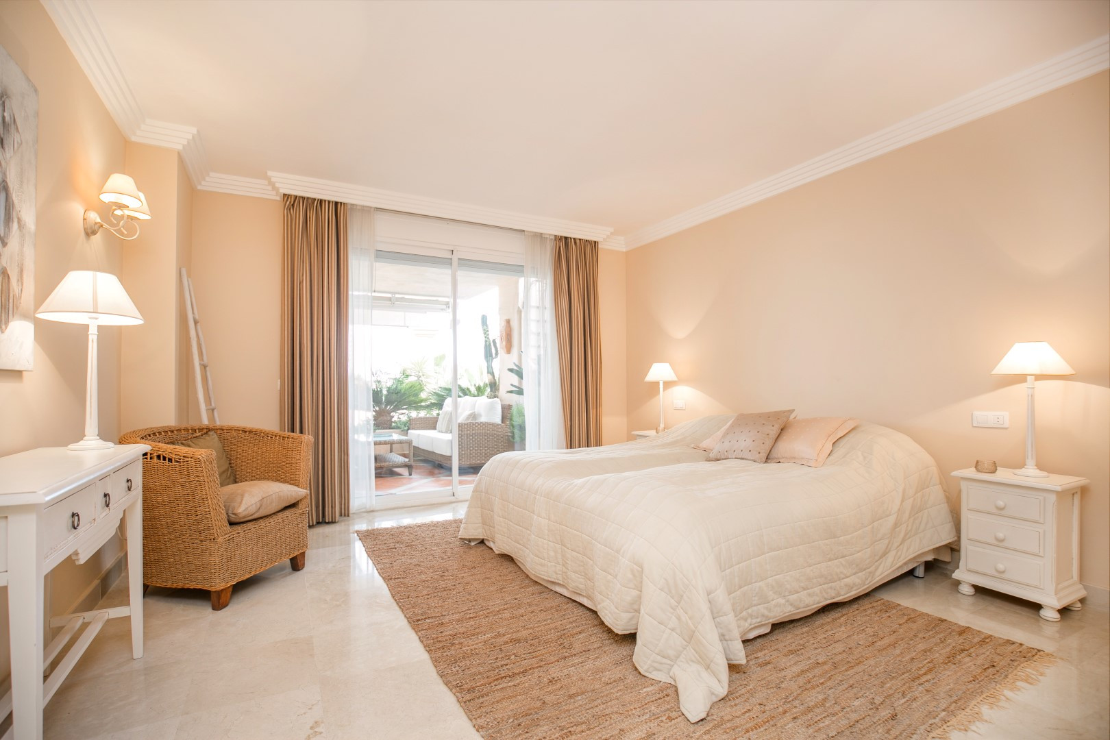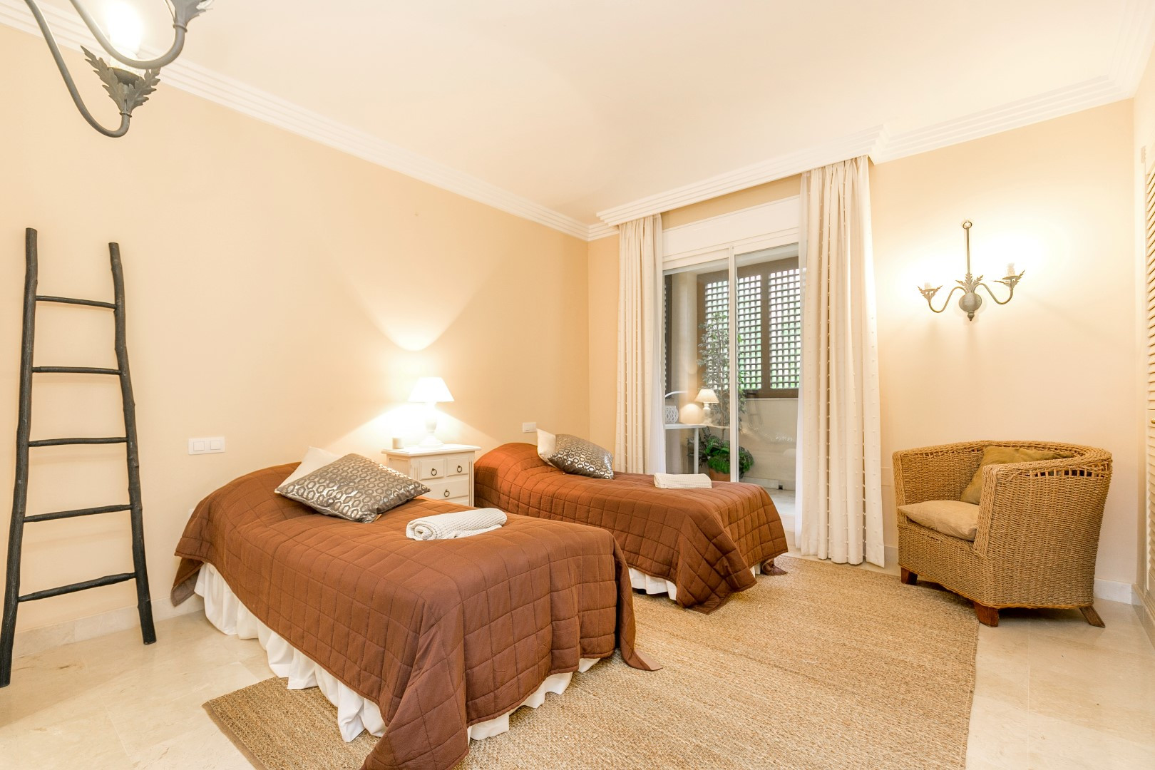 Diese Wohnung im Erdgeschoss verfügt über ein großes, offenes Wohn- und Esszimmer, eine voll ausgestattete Küche mit einem attraktiven Frühstücksbereich und einen separaten kleinen Hauswirtschaftsraum. Das Hauptschlafzimmer hat ein Doppelbett und das zweite Schlafzimmer hat zwei Einzelbetten. Beide Schlafzimmer haben ein eigenes Bad. Zusätzlich gibt es eine große Terrasse mit überdachtem und offenem Bereich, auf der Sie speisen und die warmen Abende in Marbella genießen können.