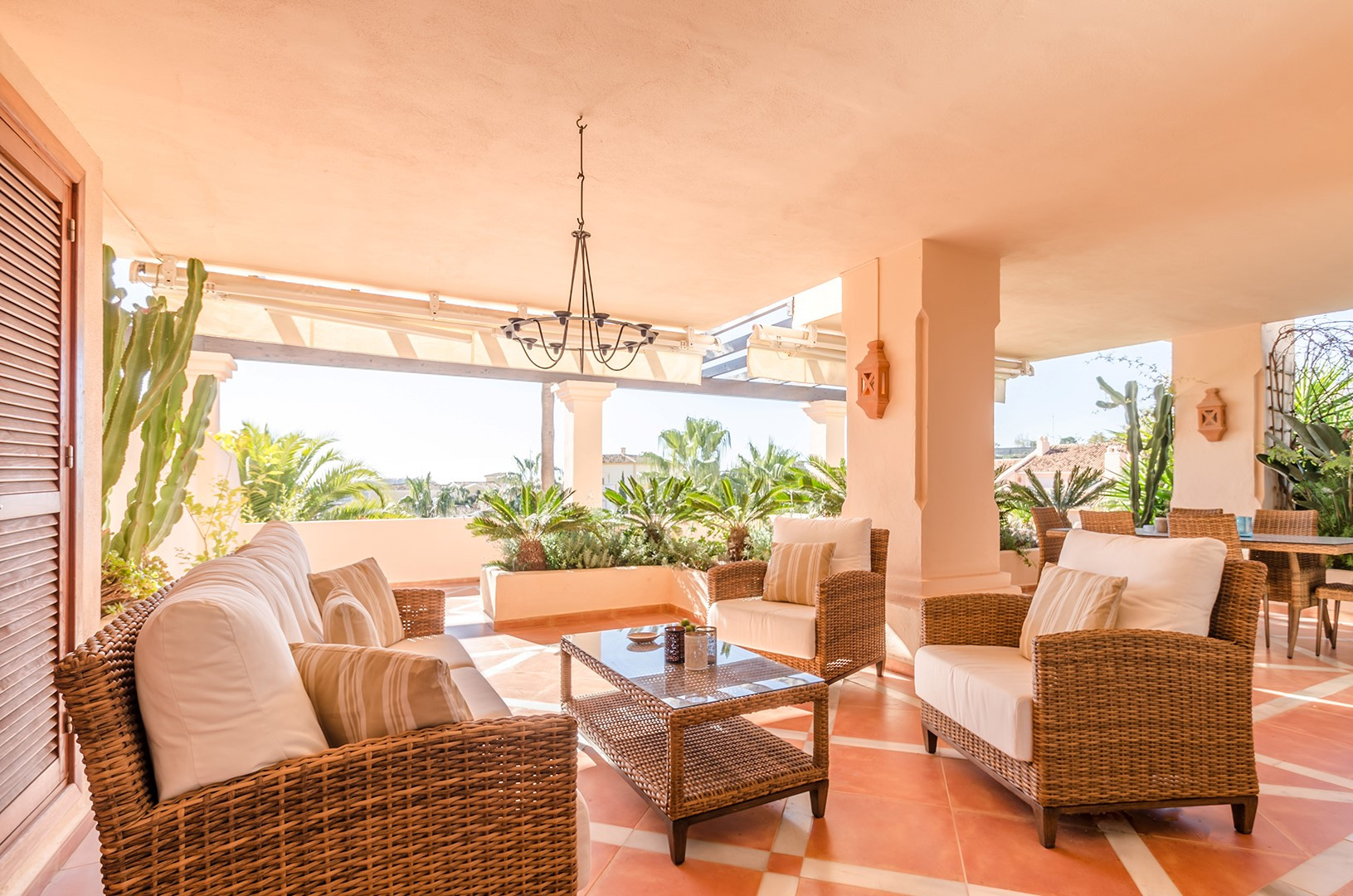 Ferienwohnung mit zwei Schlafzimmern im Erdgeschoss in einer exklusiven, geschlossenen Anlage in den Hügeln von Nueva Andalucia. Albatross Hills verfügt über schöne Swimmingpools und einen Tennisplatz, sowie ein Hallenbad, Fitnessraum und Sauna.