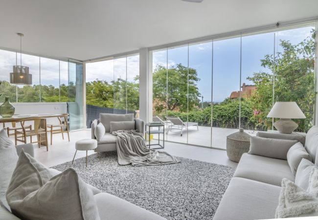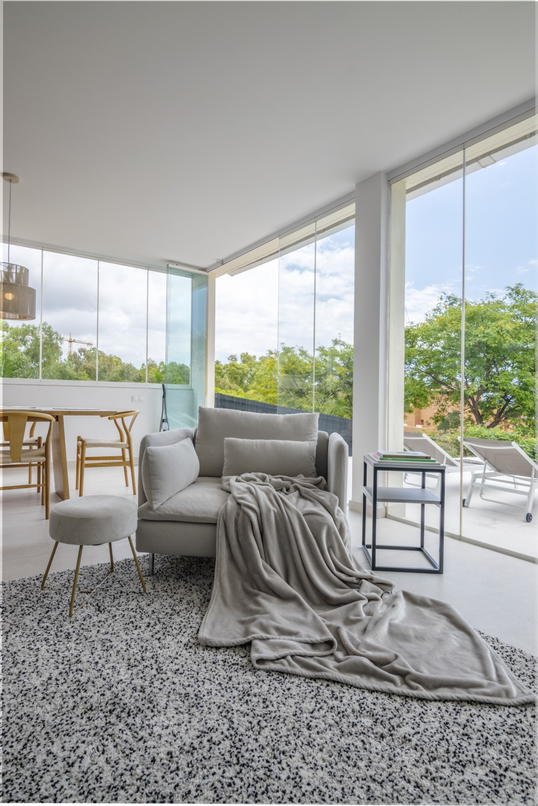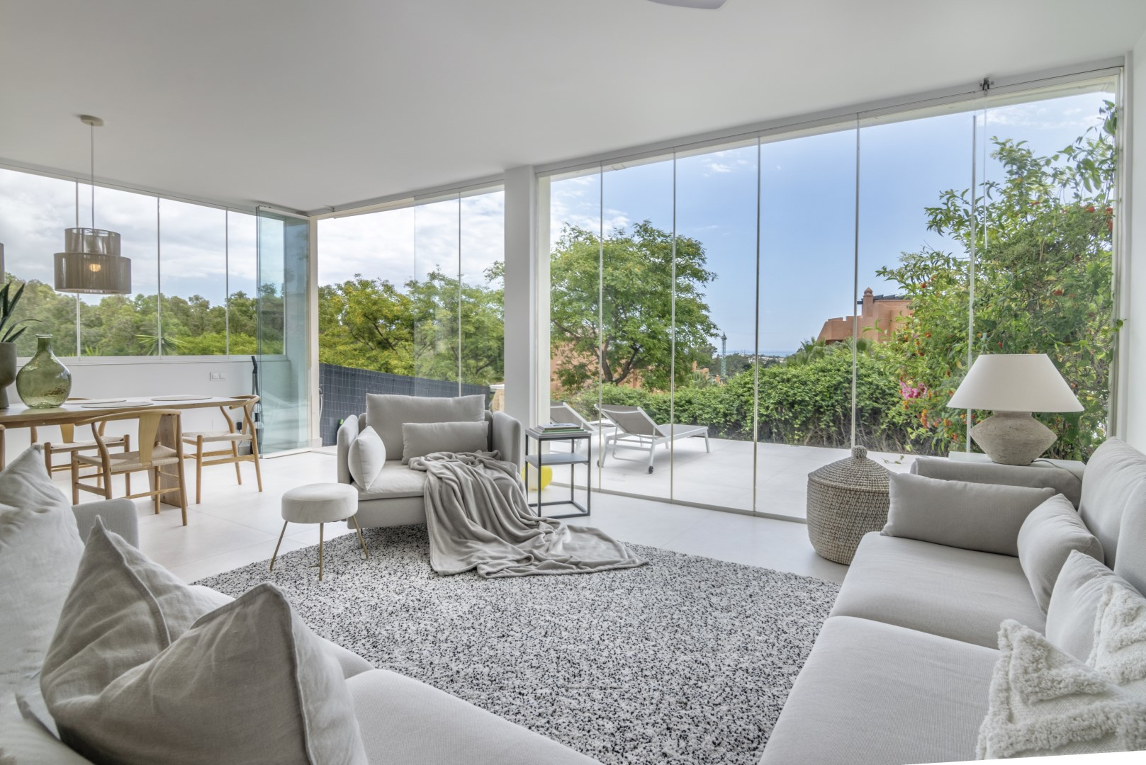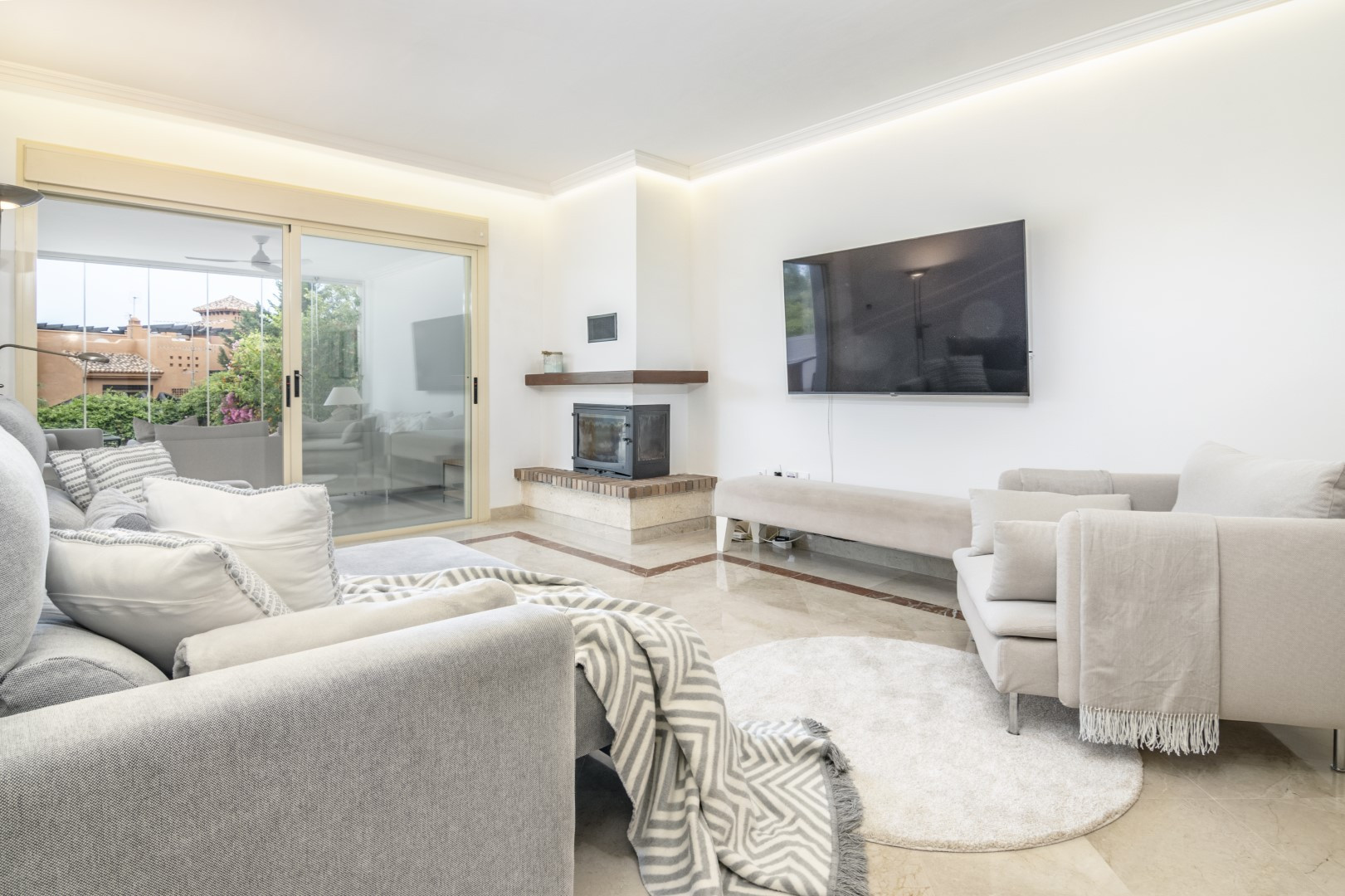 Diese teilweise renovierte 2-Bett-Wohnung bietet eine komfortable und elegante Basis für Ihren Familienurlaub. Wenn Sie die Wohnung betreten, sehen Sie auf der rechten Seite die renovierte offene Küche, die mit brandneuen Küchengeräten und allem ausgestattet ist, was Sie brauchen, um ein gutes Abendessen mit Ihren Lieben zu kochen. Geradeaus finden Sie ein modernes und dennoch gemütliches Wohnzimmer mit einem Essbereich, der sich perfekt für Familien oder Gruppen von Freunden eignet. Die überdachte Terrasse ist mit Glasschiebetüren ausgestattet, die dem Haus das beliebte Indoor/Outdoor-Gefühl verleihen. An Sommertagen erhellt die Sonne den ganzen Raum und sorgt für das ultimative Urlaubsgefühl. Hier finden Sie ein Sofa und eine Sitzecke, sowie einen großen Esstisch. Die Wohnung ist von Pflanzen umgeben, so dass Sie sich wie in Ihrer eigenen kleinen Oase fühlen.