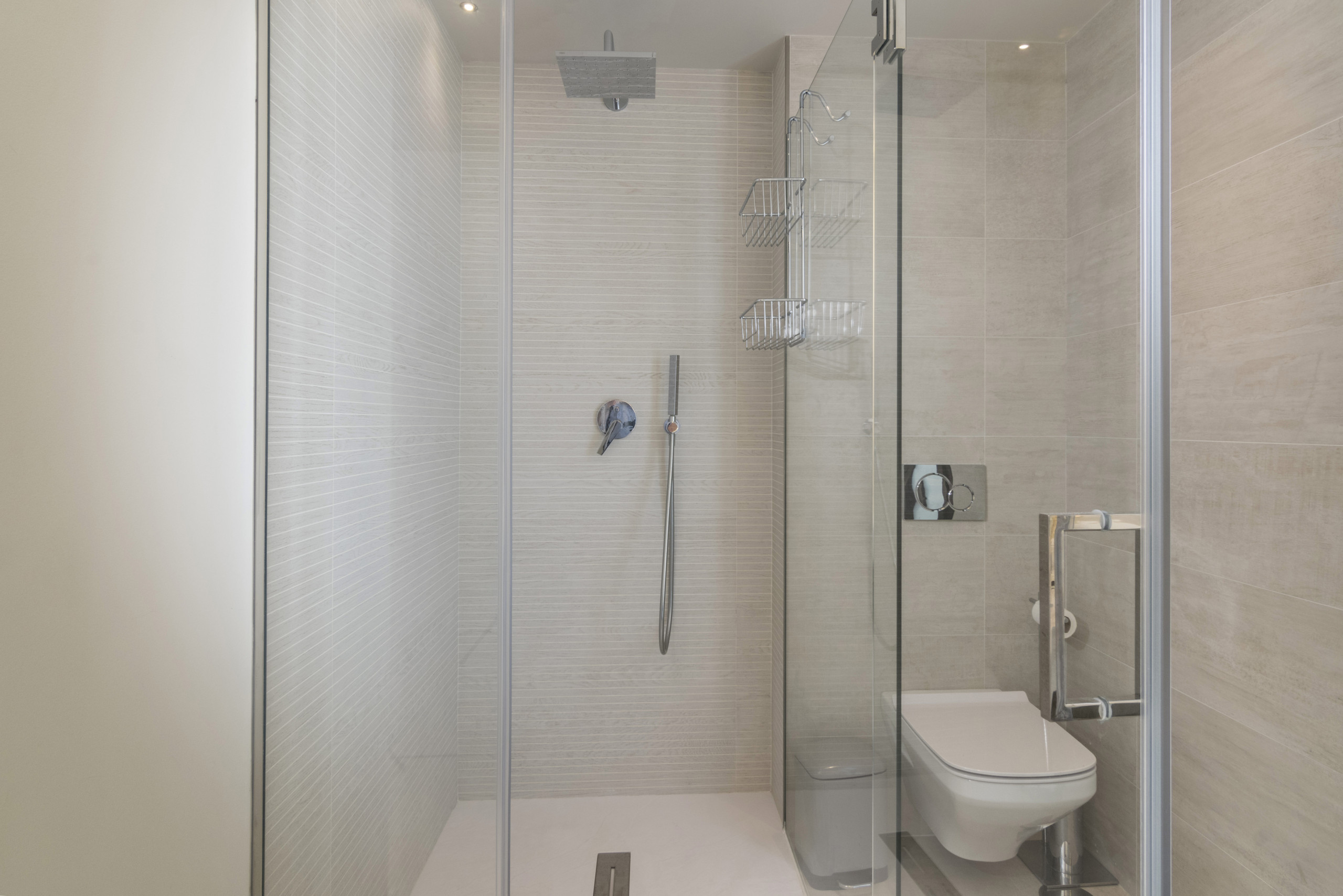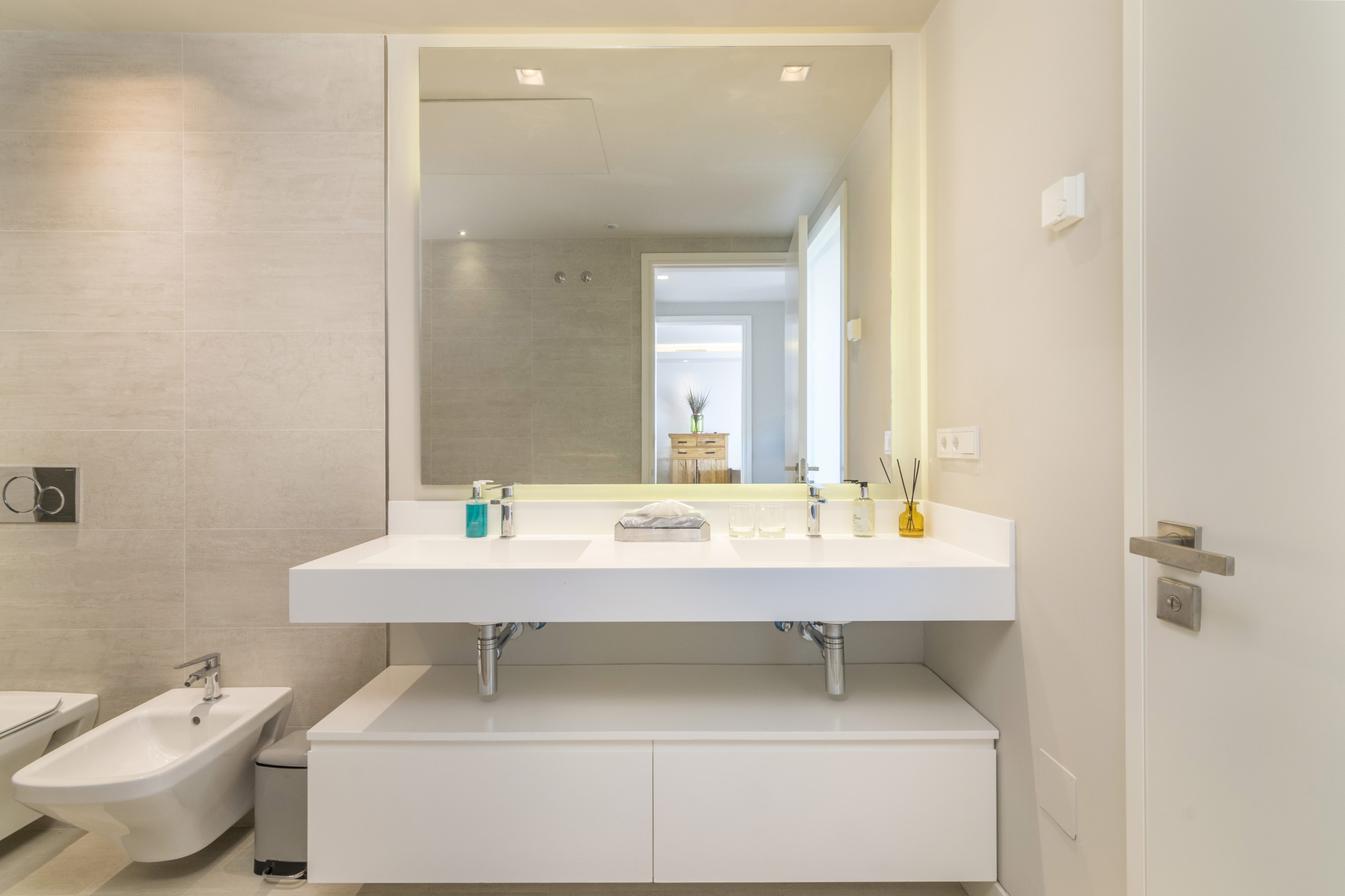 Jedes Schlafzimmer, das strategisch auf beiden Seiten des Wohnzimmers positioniert ist, verfügt über ein eigenes Bad, das sorgfältig für Komfort und Stil entworfen wurde.