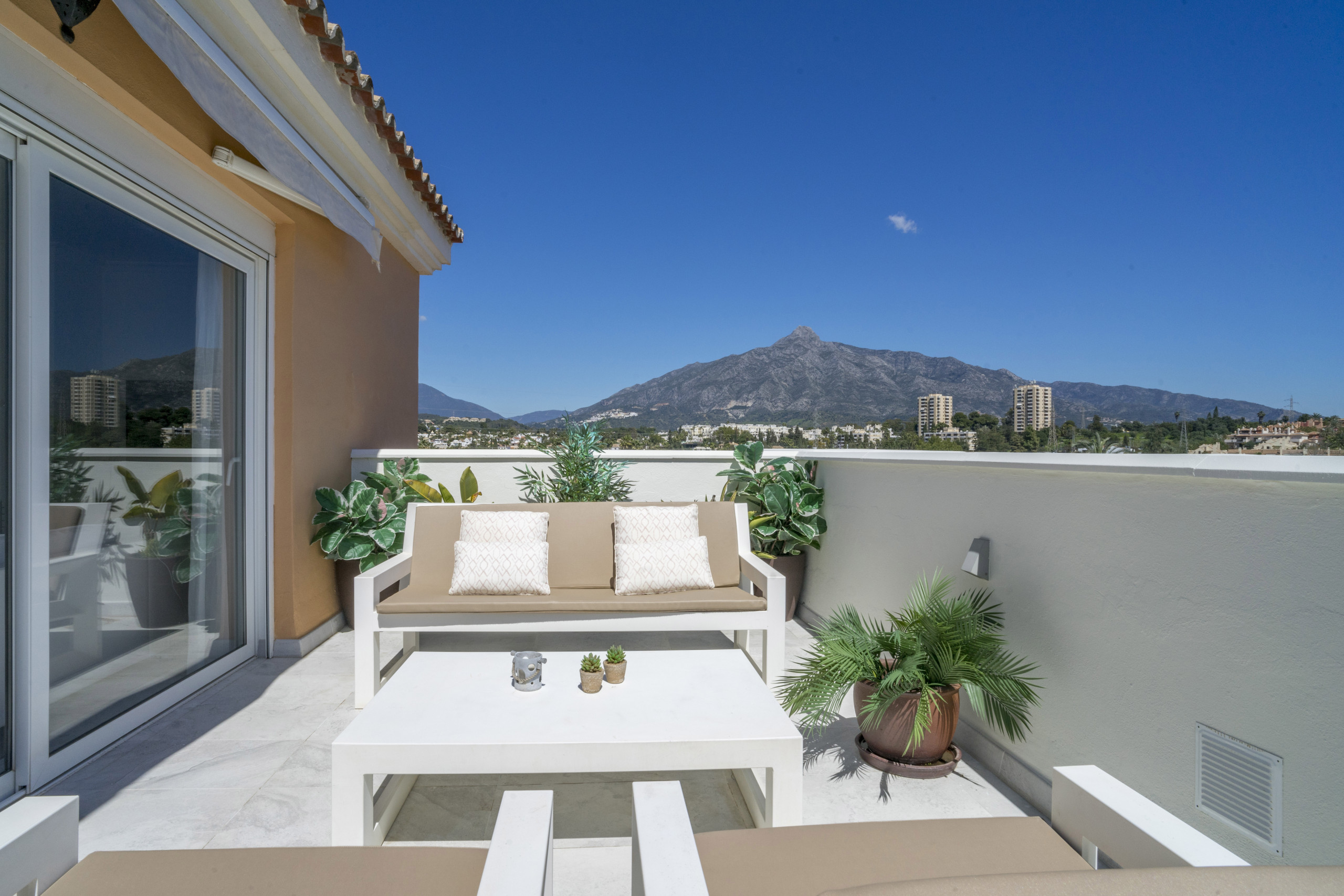 Die Hauptterrasse ist das Herzstück des Hauses. Geräumig und nach Osten ausgerichtet für Morgensonne und Panoramablicke. Es ist der perfekte Ort, um den Tag mit einem Frühstück in der Sonne zu beginnen oder nach der Erkundung von Marbella mit Abendgetränken zu entspannen.