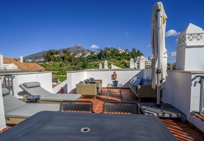 Eines der herausragenden Merkmale dieses außergewöhnlichen Penthouses ist die große Dachterrasse, die einen unvergleichlichen Panoramablick auf das Mittelmeer, die ikonische Marbella-Küste und die umliegenden Berge bietet. Die Terrasse eignet sich perfekt zum Unterhalten, sei es für ein Dinner unter freiem Himmel oder zum entspannten Sonnenbaden und Genießen des idyllischen Mittelmeerklimas, für das Marbella bekannt ist. Der Außenbereich ist geräumig genug für Sonnenbereiche, einen Grill und sogar eine Outdoor-Essecke und damit der ideale Ort zum Entspannen und Genießen der spektakulären Aussicht.