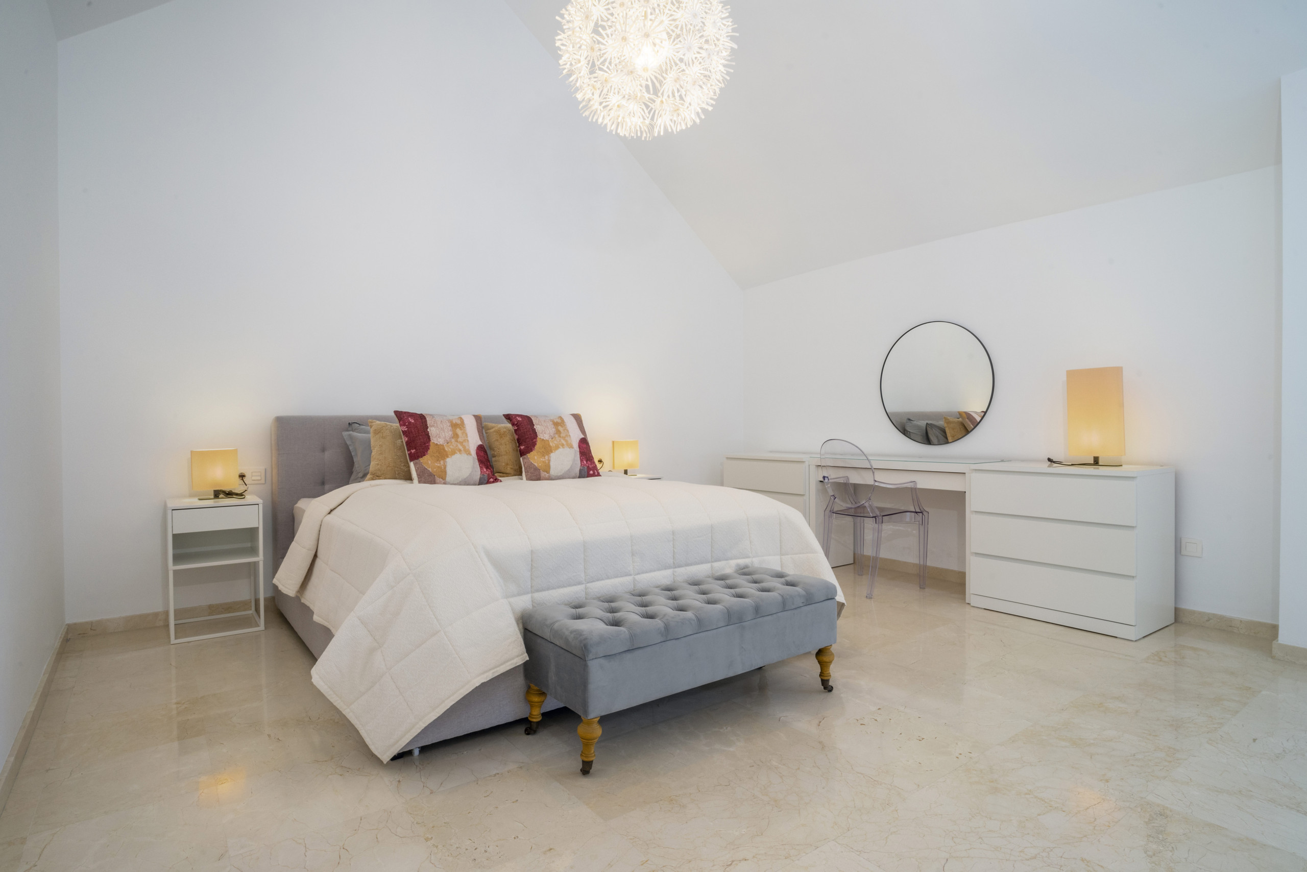 Die Anordnung dieses Penthouses ist durchdacht gestaltet, um sowohl Privatsphäre als auch Alltagskomfort zu maximieren. Die private Master-Suite befindet sich im oberen Stockwerk und bietet einen idealen Rückzugsort. Sie verfügt über einen geräumigen Ankleideraum mit reichlich Kleiderschrankplatz und einer privaten Terrasse, auf der Sie sich entspannen und teilweise Meerblick genießen können.