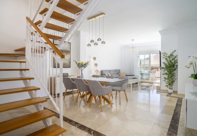 Dies ist ein wunderschönes 3-Schlafzimmer, 3-Badezimmer Duplex-Penthouse zur Miete, gelegen im Herzen des wunderbaren Golf Valley von Nueva Andalucía. Die Gegend ist bekannt für ihre üppige Umgebung, Weltklasse-Golfplätze und eine entspannte, aber lebendige Atmosphäre. Die Lage ist fantastisch, mit kurzer Entfernung zu allen Annehmlichkeiten, die Sie benötigen, um Ihren Urlaub in vollen Zügen zu genießen. Dazu gehören Restaurants, Geschäfte, Golf, Strände, Puerto Banús und vieles mehr. Sie können die beliebten Aloha-Restaurants mit nur 10 bis 15 Minuten Fußweg erreichen!