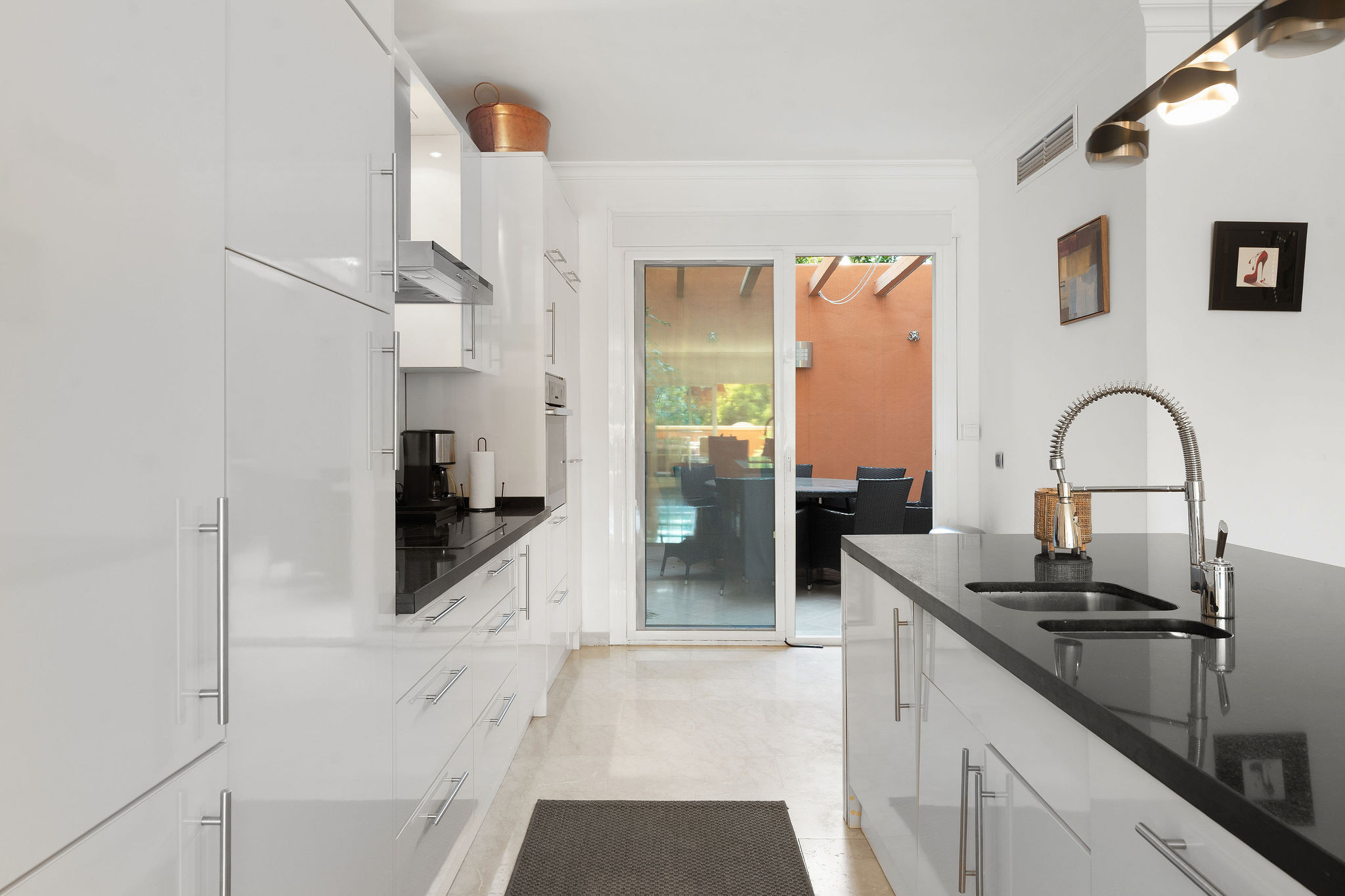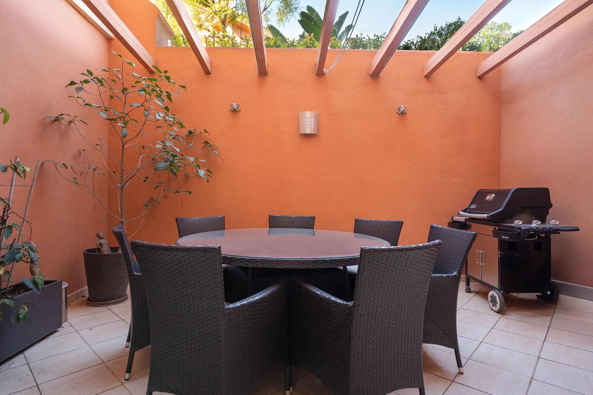 Die Wohnung erstreckt sich über zwei Ebenen und bietet großzügigen Wohnraum. Auf der Eingangsebene verbindet eine offene Grundrissgestaltung nahtlos den Ess- und Wohnbereich mit einer voll ausgestatteten modernen Küche und schafft eine helle und gesellige Atmosphäre. Vom Wohnzimmer aus führen Schiebetüren direkt auf eine private Terrasse mit einer gemütlichen Sitzecke - perfekt für den Morgenkaffee oder Abendgetränke. Von der Terrasse führen einige Stufen in einen privaten Garten von etwa 30 qm. Dieser Außenbereich eignet sich ideal zum Entspannen, Sonnenbaden oder zum Verbringen von Qualitätszeit mit Familie und Freunden in völliger Privatsphäre. Die Küche öffnet sich zu einer zweiten Terrasse mit Esstisch und Grill, perfekt für Mahlzeiten im Freien. Diese Ebene umfasst außerdem ein Hauptschlafzimmer mit eigenem Badezimmer, ein Gästezimmer und eine separate Gästetoilette, die sowohl Komfort als auch Privatsphäre bieten.