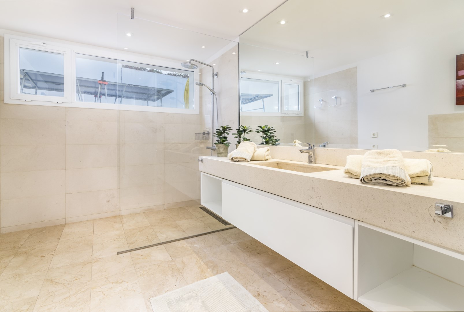 Nun zur Besichtigung: Wenn Sie das Haupthaus betreten, werden Sie von einer einladenden Eingangshalle empfangen. Auf der linken Seite finden Sie eine Gästetoilette und die Küche mit Essbereich, die sowohl Zugang zu einem Patio mit Esstisch auf der Rückseite des Hauses hat, als auch zur Terrasse und zum Poolbereich. Auf dieser Seite des Hauses befinden sich auch zwei Doppelschlafzimmer mit Badezimmern en-suite. Wenn Sie am Eingang rechts abbiegen, gelangen Sie in den geräumigen Wohnbereich, der geschmackvoll eingerichtet ist und ein Gefühl von Wärme und Zuhause vermittelt. In dieser Richtung befinden sich zwei weitere Schlafzimmer mit direktem Zugang zur Terrasse und zum Poolbereich, so dass diese Räume mit viel natürlichem Licht durchflutet werden. Beide Schlafzimmer haben ein eigenes Bad. Die oberste Etage ist der Master-Suite gewidmet, mit begehbarem Kleiderschrank und en-suite Badezimmer und Zugang zu einer schönen Terrasse mit Blick auf den Golfplatz.