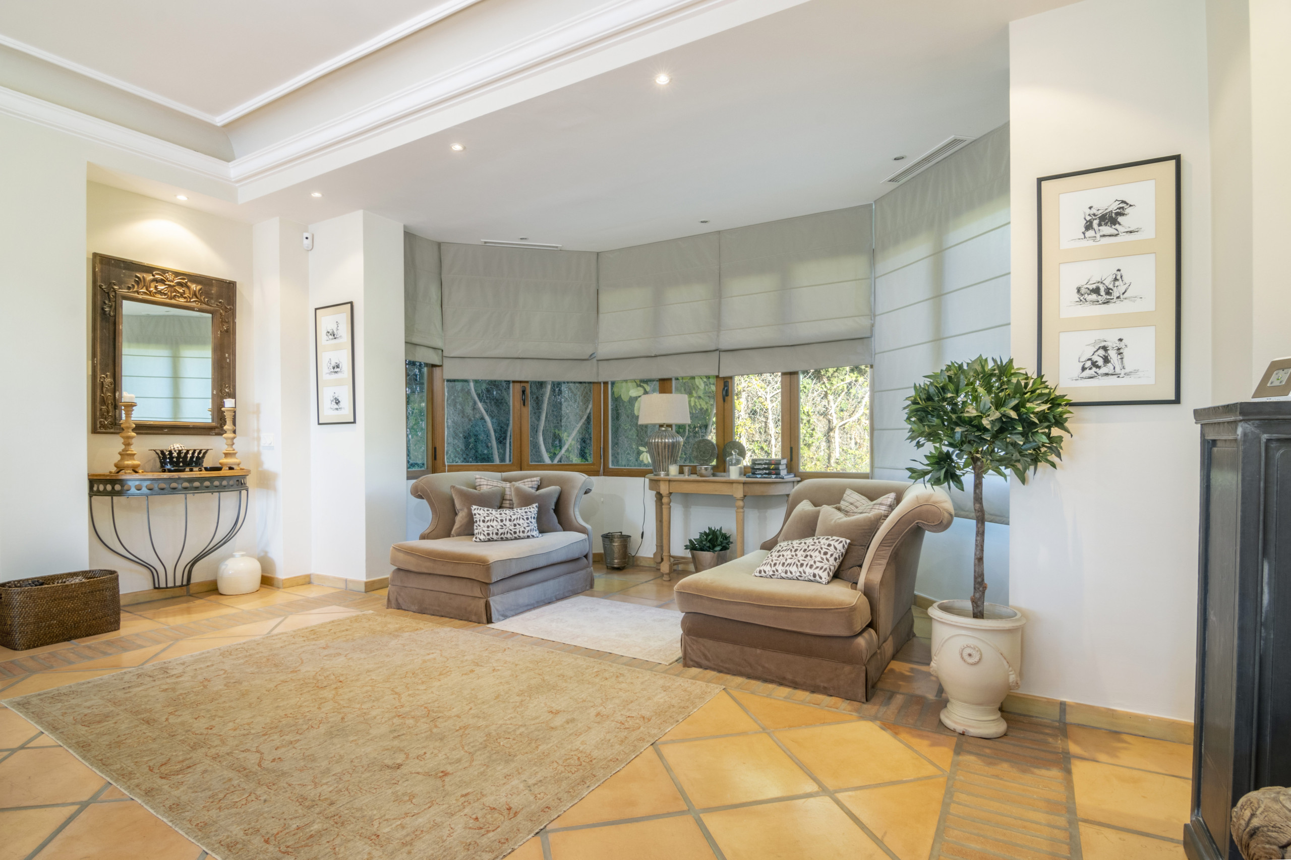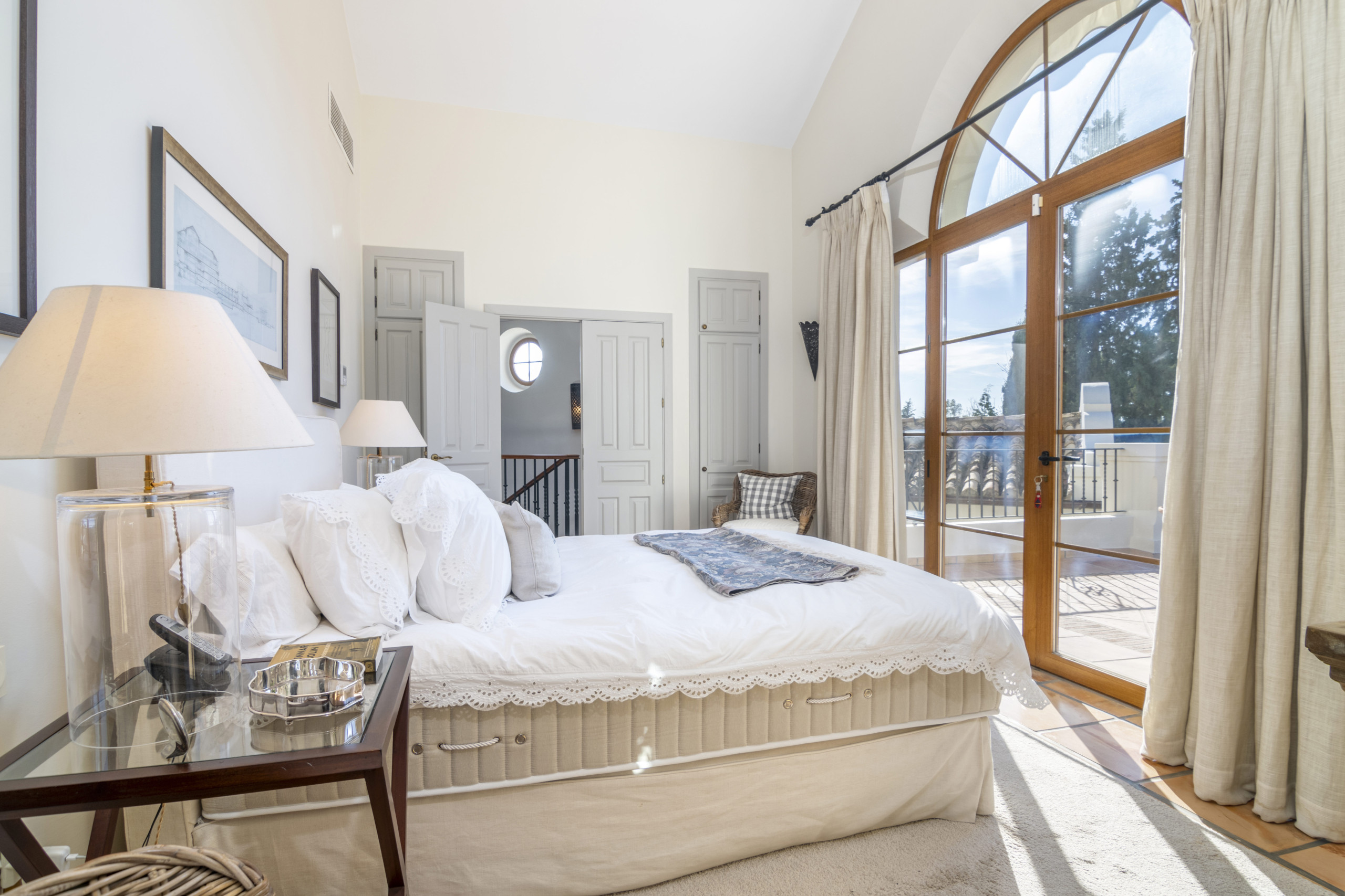 Im Obergeschoss bieten der Hauptschlafraum und zusätzliche Schlafzimmer luxuriöse private Badezimmer und Zugang zu einer großzügigen Terrasse, perfekt zum Sonnenbaden. Das Hauptschlafzimmer mit Bad verfügt über atemberaubende Ausblicke auf die umgebenden Bäume, eine große Terrasse, einen geräumigen Ankleideraum und ein luxuriöses Badezimmer mit Dusche und Badewanne.