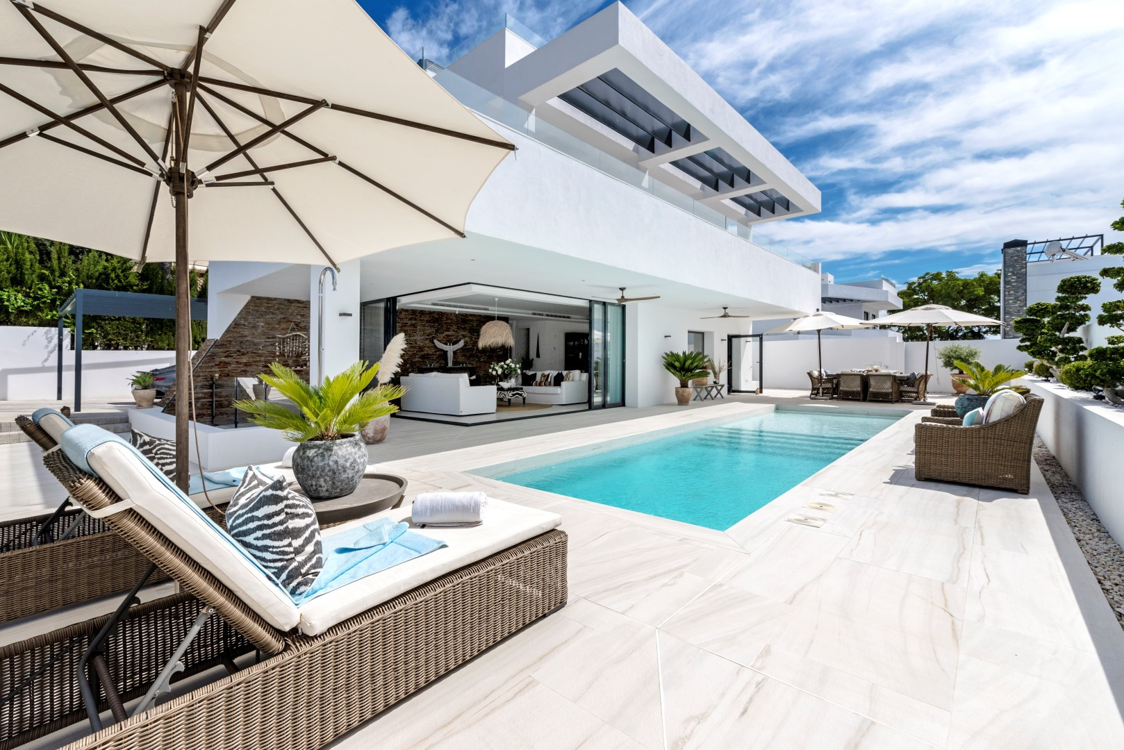 Die Villa in San Pedro de Alcántara verfügt über 5 Schlafzimmer und hat eine Kapazität für 10 Person(en). Unterkunft verfügt über 288 m². Die Unterkunft verfügt über ein umzäuntes Grundstück, eine Terrasse, eine Waschmaschine, einen Grillplatz, ein Internetanschluss (WLAN), ein Föhn, ein Balkon, eine Alarmanlage, eine Wärmepumpe, eine Klimaanlage in der ganzen Unterkunft, ein Privatpool, einen klimatisierter Privatpool, eine überdachter Parkplatz (2 Stellplätze), ein Fernsehgerät, Satelliten-TV (in den folgenden Sprache(n): Spanisch, Englisch, Deutsch, Holländisch, Französisch, Schwedisch, Norwegisch).Die Küche ist ausgestattet in einen Kühlschrank, eine Mikrowelle, ein Backofen, Gefrierschrank, eine Spülmaschine, Geschirr/Besteck, Kochutensilien, eine Kaffeemaschine, einen Toaster, einen Wasserkocher und eine Saftpresse.