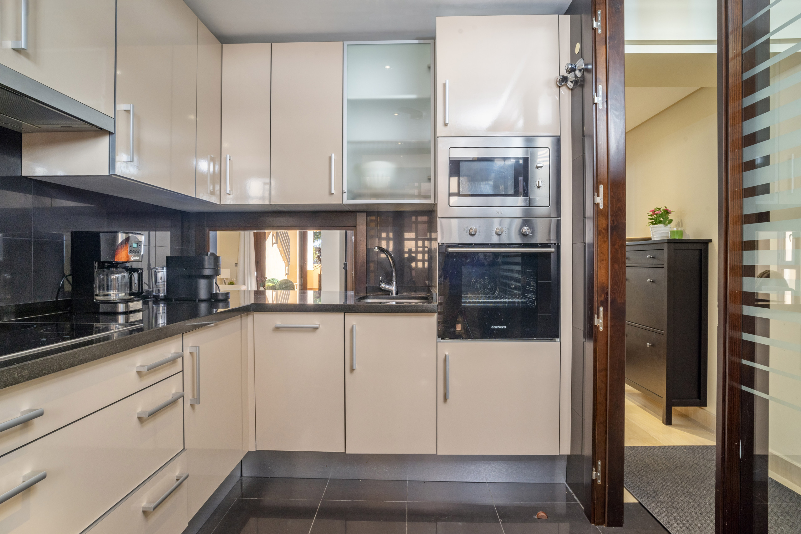 El apartamento te recibe con una zona de estar y comedor diáfana y luminosa que está elegantemente decorada y bañada en luz natural, con puertas corredizas de cristal que se abren directamente a una terraza cubierta privada. La cocina totalmente equipada cuenta con encimeras de granito y todos los electrodomésticos esenciales, además de un encantador rincón de desayuno para comidas informales.