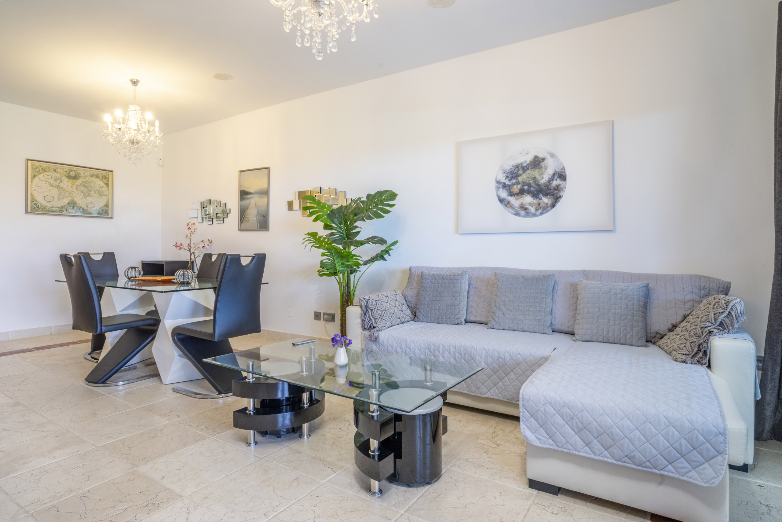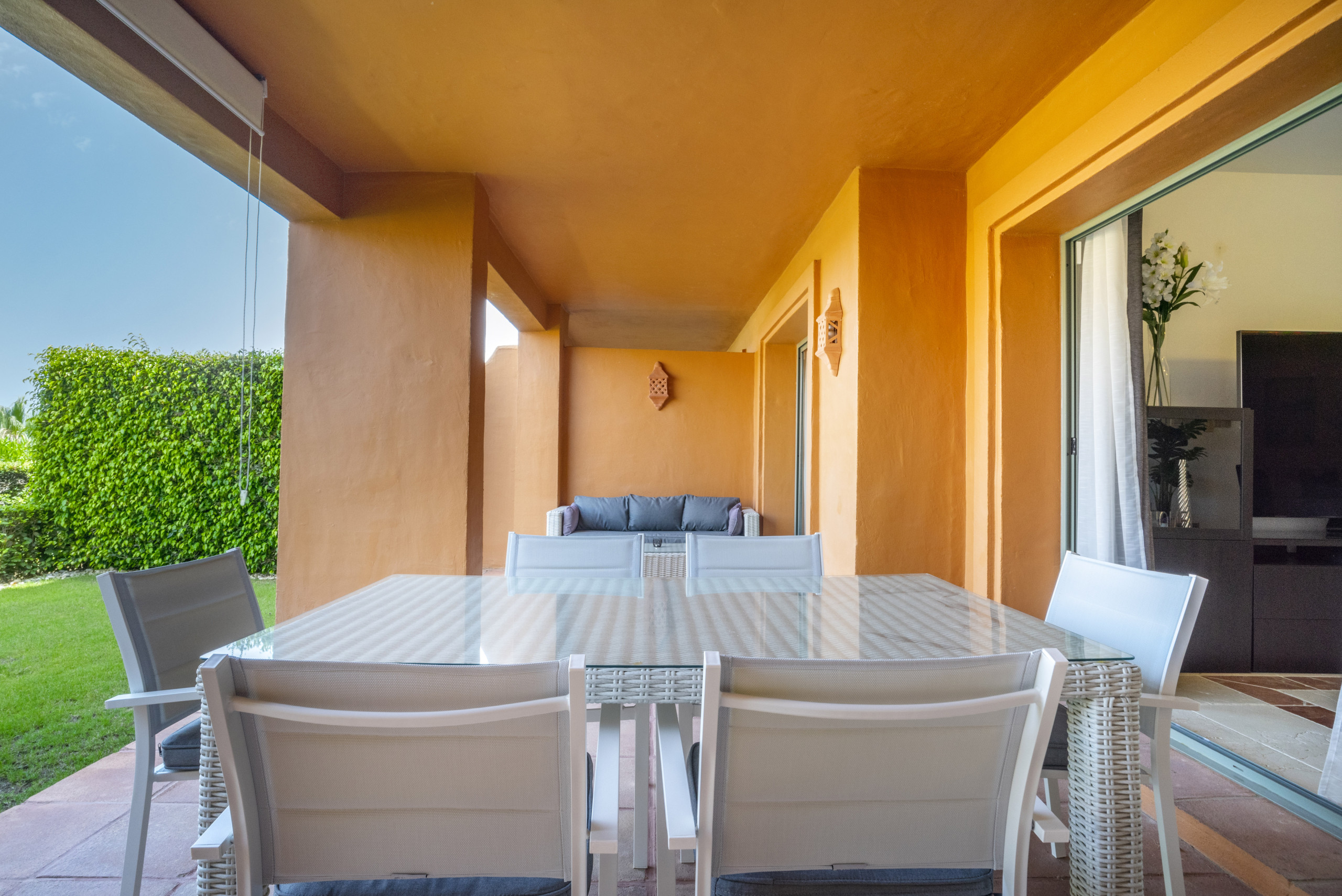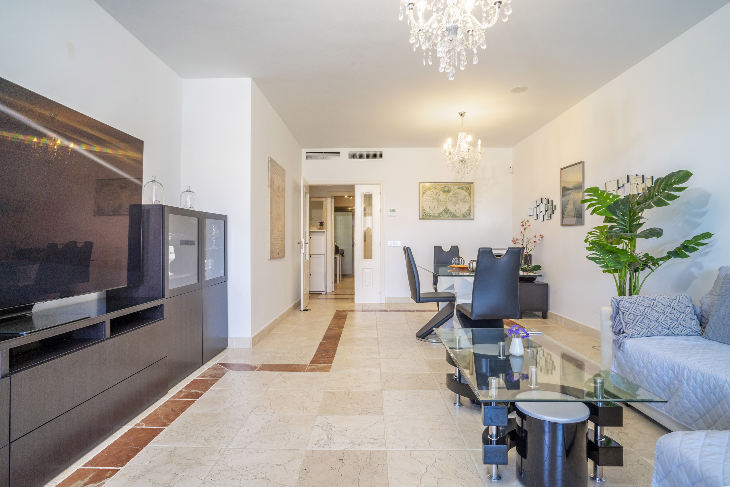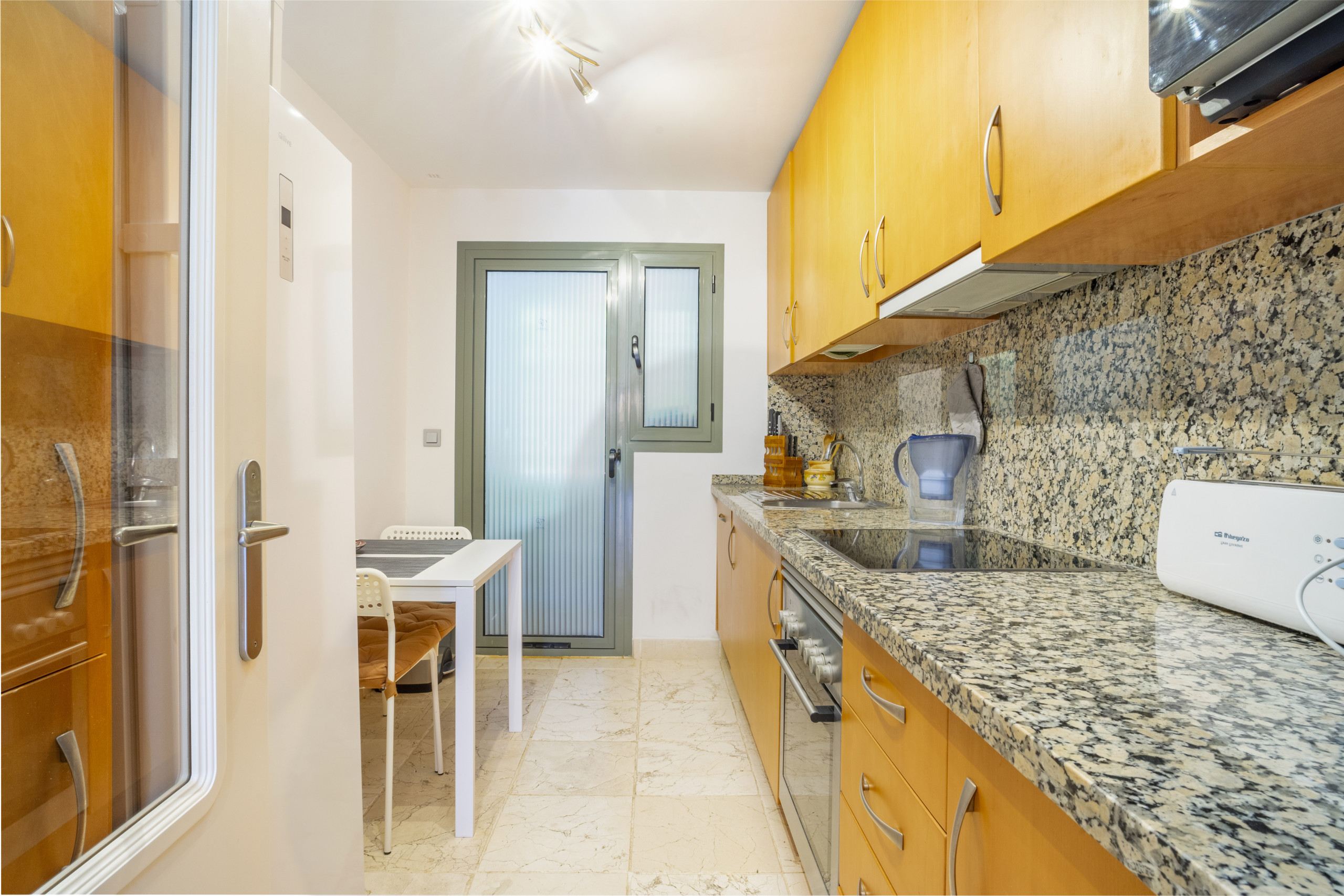 El apartamento te recibe con una zona de estar y comedor diáfana y luminosa que está elegantemente decorada y bañada en luz natural, con puertas corredizas de cristal que se abren directamente a una terraza cubierta privada. La cocina totalmente equipada cuenta con encimeras de granito y todos los electrodomésticos esenciales, además de un encantador rincón de desayuno para comidas informales.