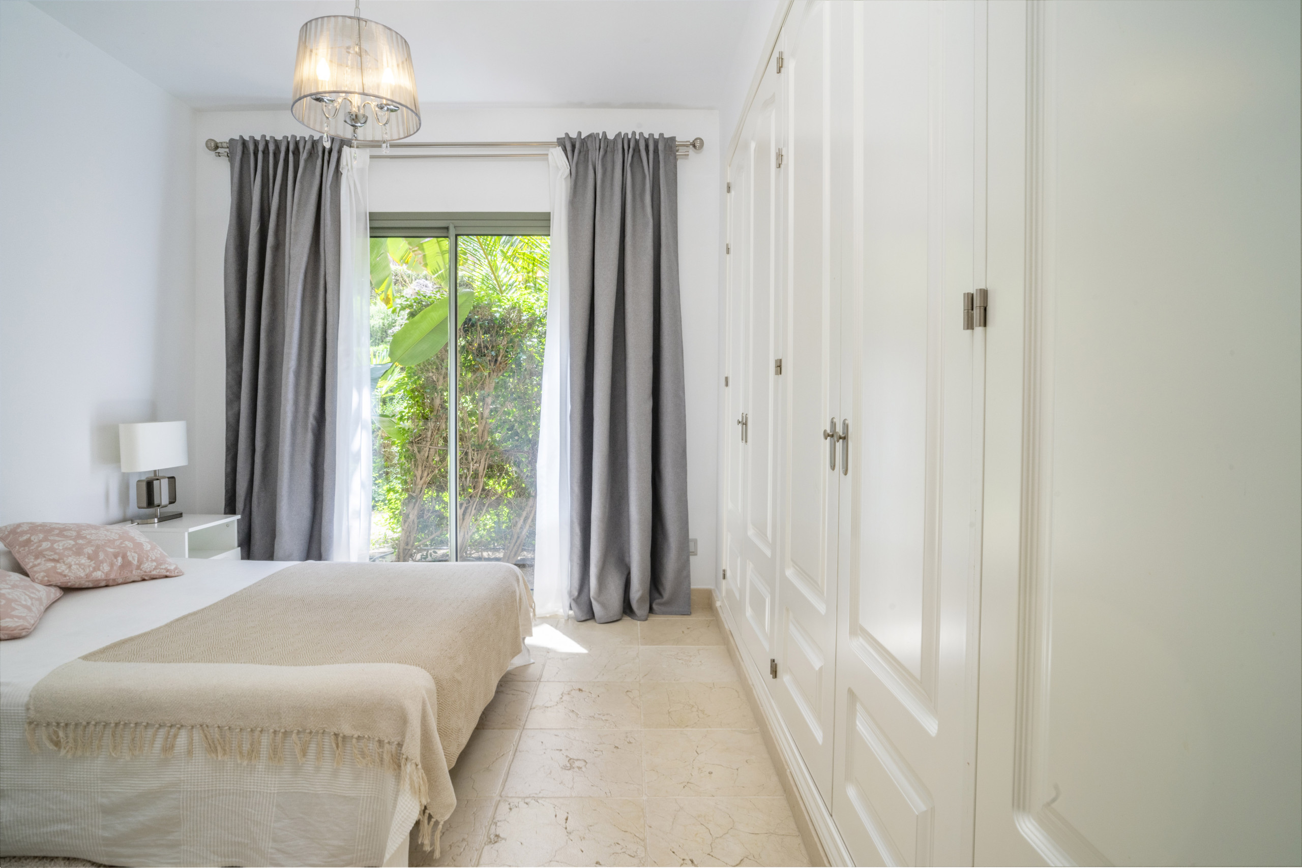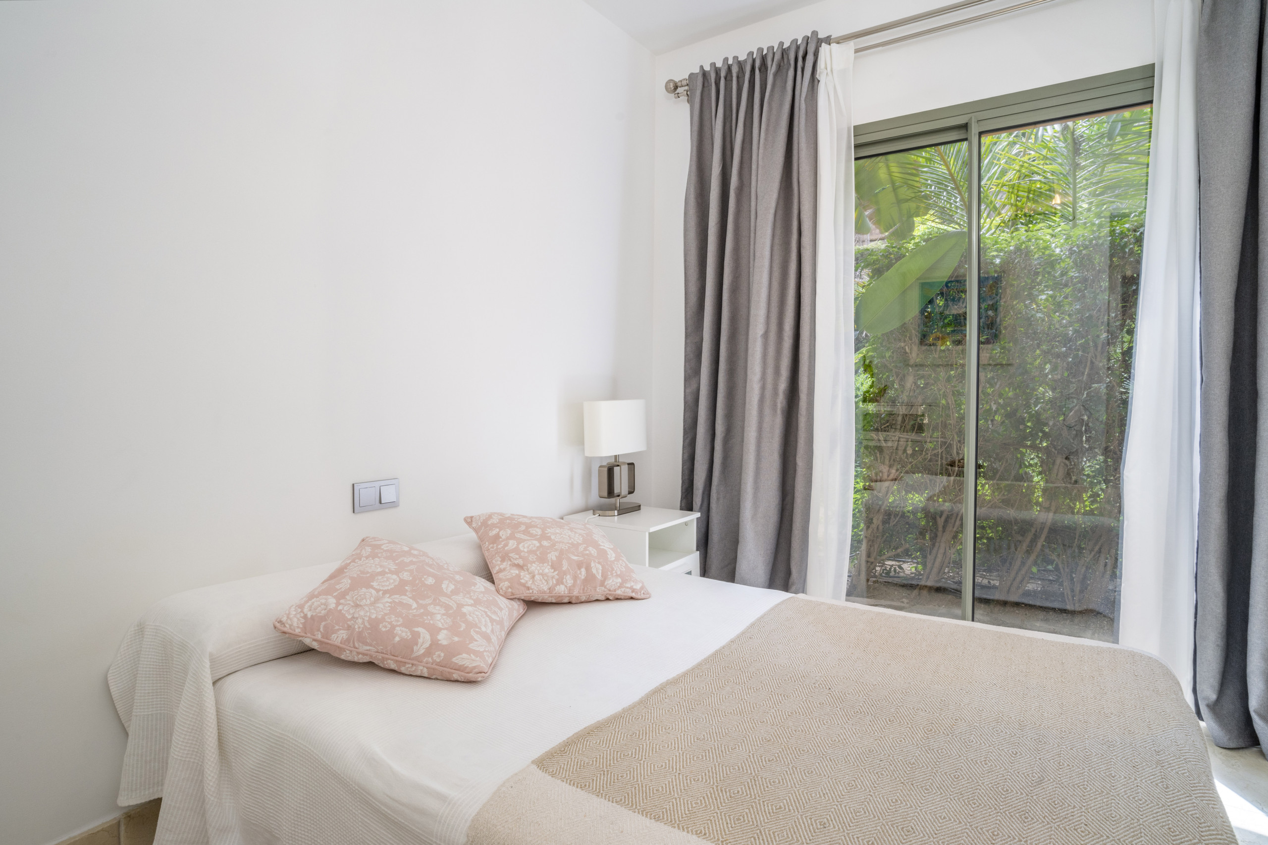 El dormitorio principal incluye su propio cuarto de baño en suite y tiene acceso directo a la terraza, mientras que el segundo dormitorio tiene vistas a una vegetación exuberante y ofrece una atmósfera acogedora y relajante. Ambos dormitorios disponen de armarios empotrados y están decorados con gusto en tonos suaves y neutros para crear un espacio tranquilo y acogedor.