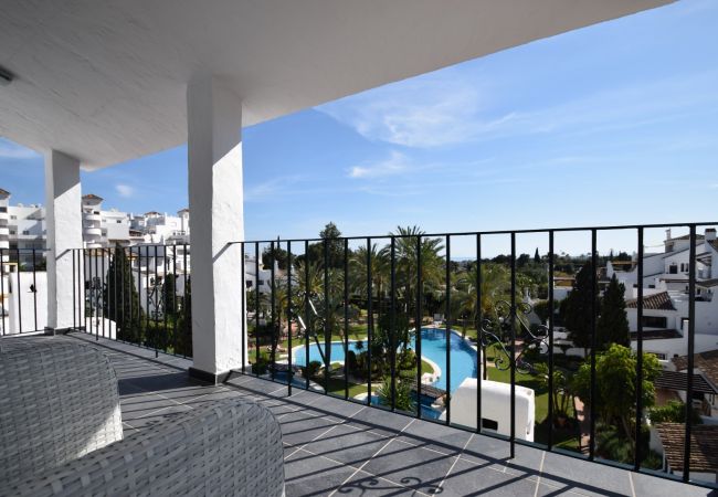 Apartamento de 2 dormitorios disponible para alquiler de vacaciones situado en la comunidad cerrada de Aloha Gardens con seguridad las 24 horas. La comunidad cuenta con hermosos jardines comunitarios y 3 piscinas, una de ellas climatizada. El apartamento está totalmente renovado, incluyendo una cocina actualizada, dos dormitorios de buen tamaño, 1 baño con hidromasaje y una cómoda sala de estar con acceso a la terraza. Gran apartamento en una excelente ubicación. La propiedad cuenta con canales de televisión españoles y también sistema de Apple TV donde también se puede utilizar Netflix.