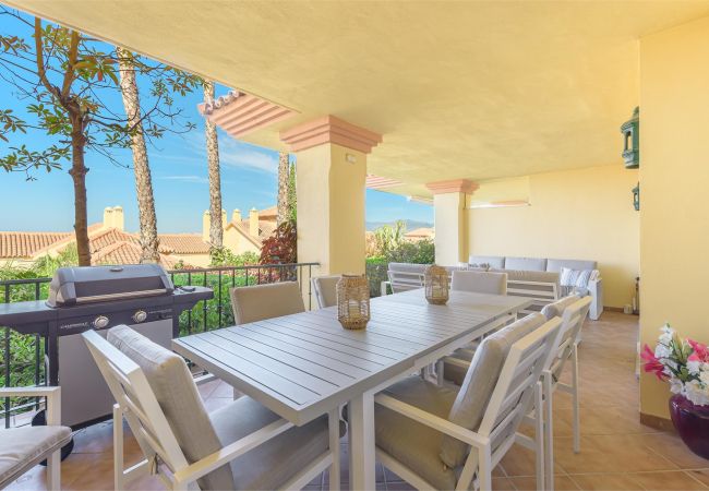 Apartamento de 2 dormitorios disponible para alquiler de vacaciones situado en la comunidad cerrada de Aloha Gardens con seguridad las 24 horas. La comunidad cuenta con hermosos jardines comunitarios y 3 piscinas, una de ellas climatizada. El apartamento está totalmente renovado, incluyendo una cocina actualizada, dos dormitorios de buen tamaño, 1 baño con hidromasaje y una cómoda sala de estar con acceso a la terraza. Gran apartamento en una excelente ubicación. La propiedad cuenta con canales de televisión españoles y también sistema de Apple TV donde también se puede utilizar Netflix.
