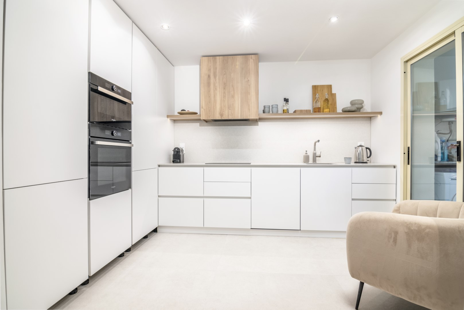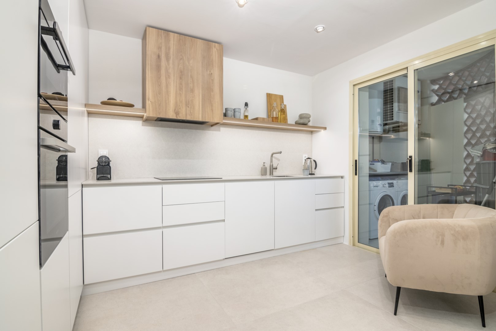 Este apartamento de 2 dormitorios parcialmente reformado ofrece una base cómoda y elegante para sus vacaciones en familia. Al entrar tiene la cocina abierta renovada a la derecha, equipada con electrodomésticos nuevos y todo lo necesario para cocinar una buena cena con sus seres queridos. Más adelante, encontrará un moderno y acogedor salón con zona de comedor, perfecto para familias o grupos de amigos. La terraza interior está equipada con puertas correderas de cristal que le dan la sensación interior/exterior tan apreciada de la casa. En los días de verano el sol ilumina toda la habitación para la última sensación de vacaciones. Aquí encontrará un sofá y una zona de estar, así como una gran mesa de comedor. El apartamento está rodeado de plantas que hace que el apartamento se sienta muy privado y como si estuvieras en tu propio pequeño oasis.