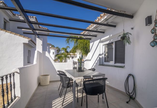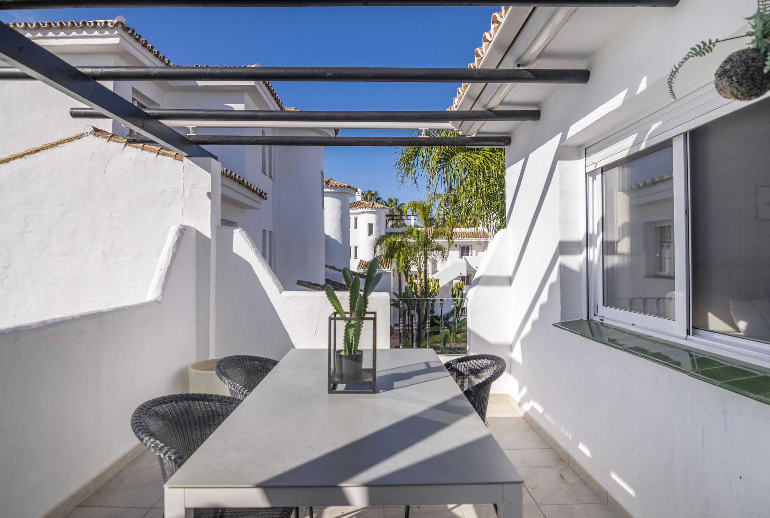 Apartamento de 2 dormitorios disponible para alquiler de vacaciones situado en la comunidad cerrada de Aloha Gardens con seguridad las 24 horas. La comunidad cuenta con hermosos jardines comunitarios y 3 piscinas, una de ellas climatizada. El apartamento está totalmente renovado, incluyendo una cocina actualizada, dos dormitorios de buen tamaño, 1 baño con hidromasaje y una cómoda sala de estar con acceso a la terraza. Gran apartamento en una excelente ubicación. La propiedad cuenta con canales de televisión españoles y también sistema de Apple TV donde también se puede utilizar Netflix.