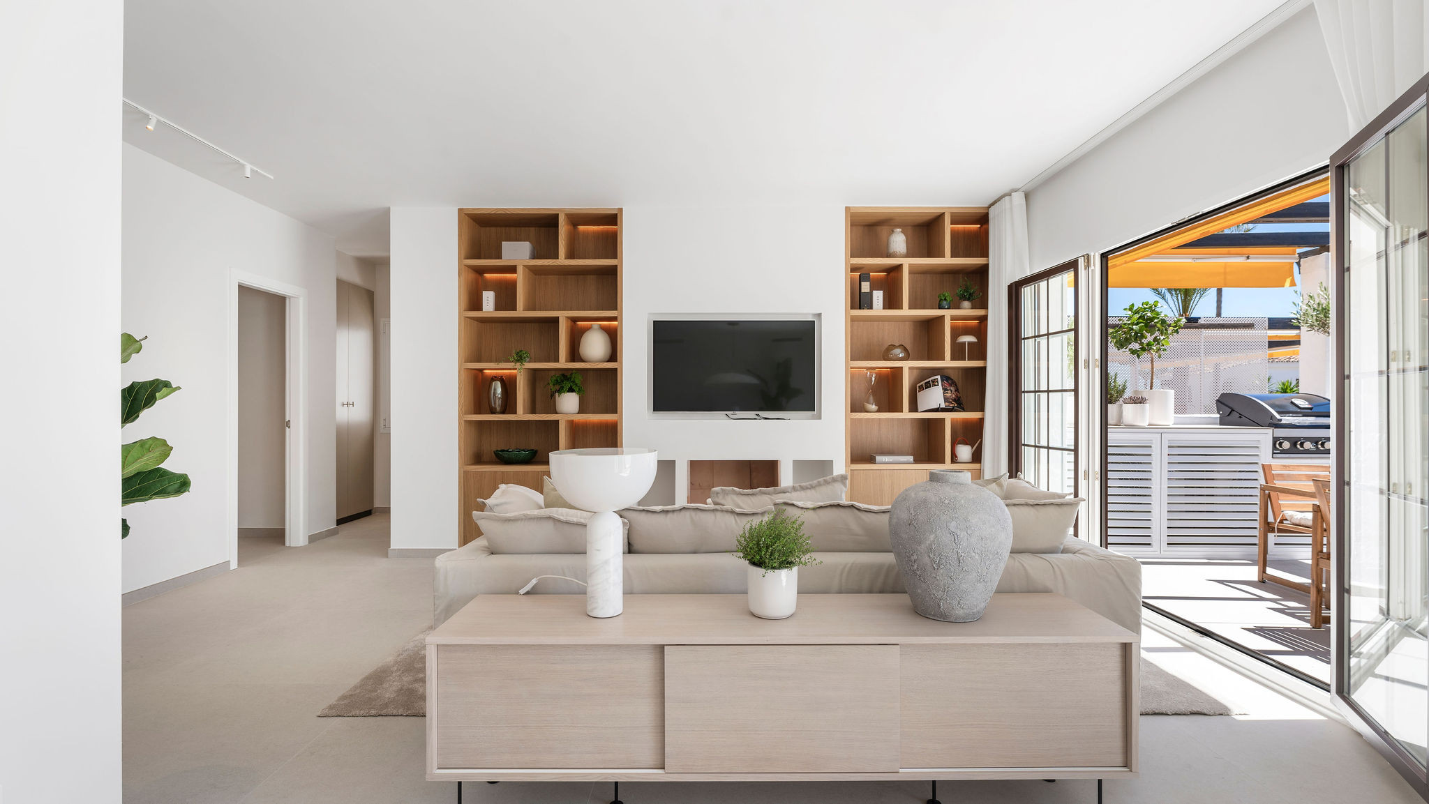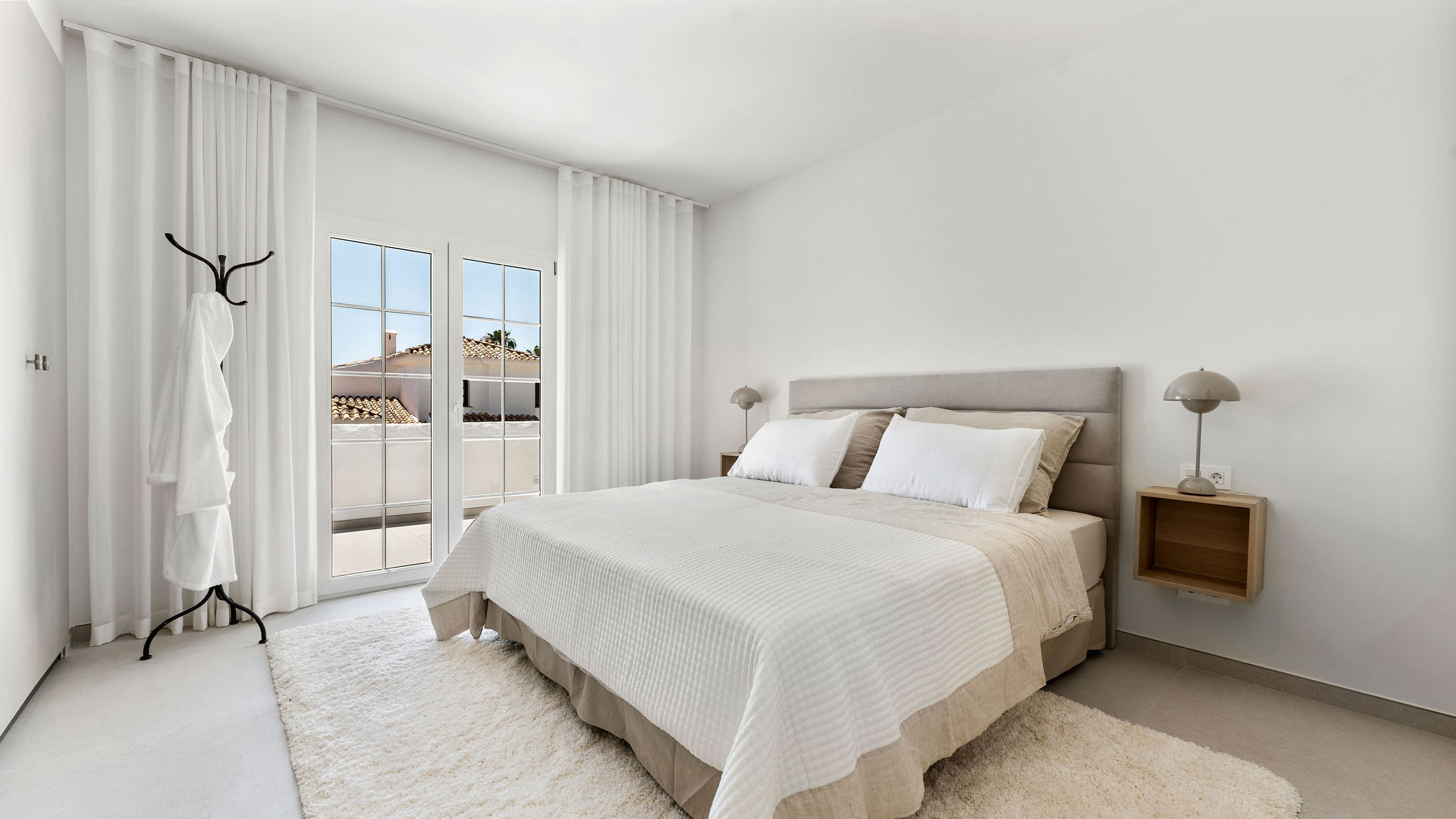 A la entrada, el impresionante diseño de planta abierta del apartamento y los elegantes interiores de inspiración nórdica marcan el tono de una experiencia inolvidable. Este espacio de 3 dormitorios y 2 baños te da la bienvenida con un amplio dormitorio doble a la derecha y una cocina abierta y una zona de estar al frente.