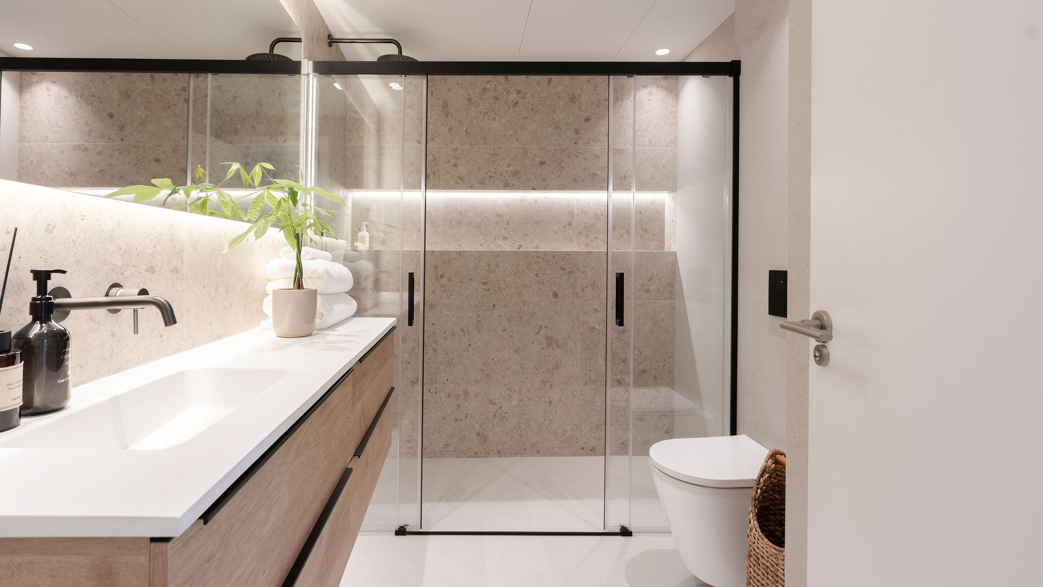 La suite principal cuenta con un baño en suite y acceso directo a la terraza. Los otros dos dormitorios comparten un hermoso baño.
