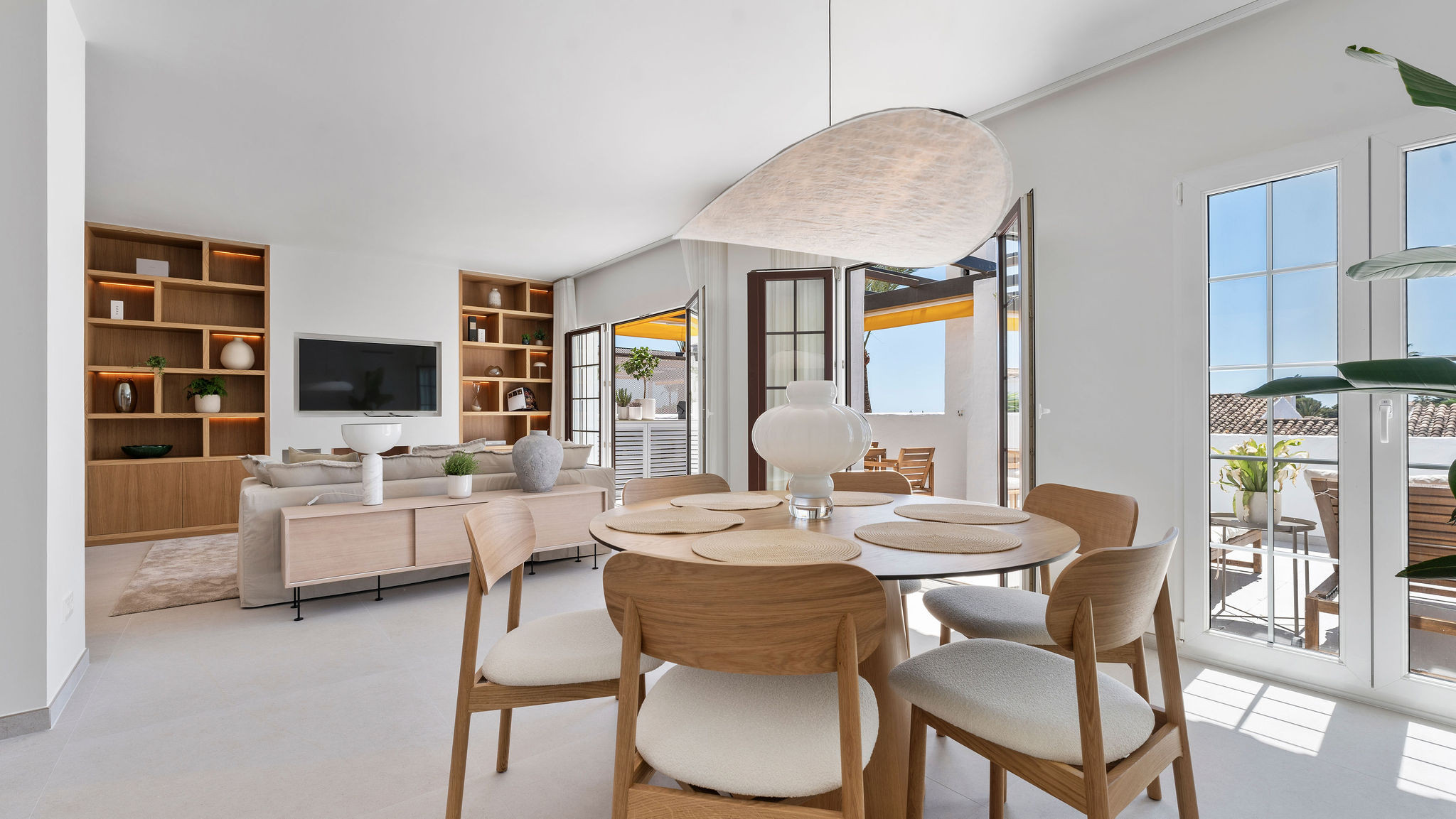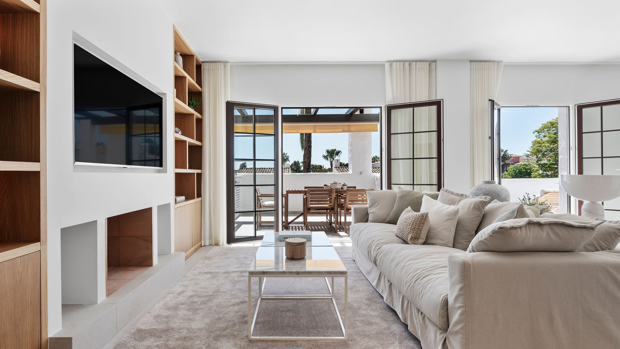 El ático cuenta con 2 dormitorios espaciosos, un sofá cama cómodo en el área de estar, y 2 baños completamente renovados, lo que lo hace ideal para hasta 6 huéspedes. El interior está inundado de luz natural, creando una atmósfera cálida y acogedora en todo el espacio. El área de estar y comedor de planta abierta fluye sin esfuerzo hacia la terraza, lo que lo hace perfecto para socializar o simplemente relajarse después de un día explorando Marbella.