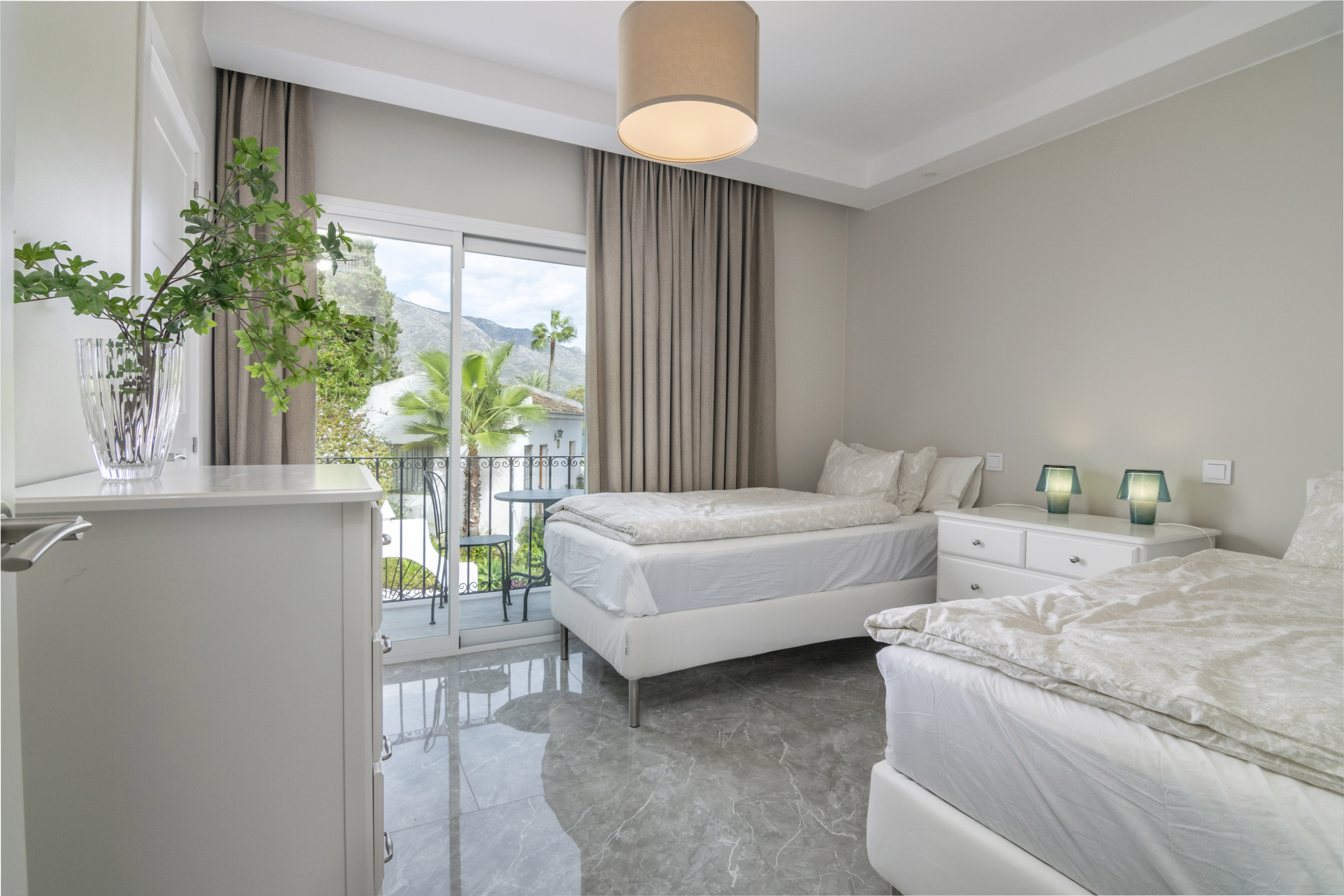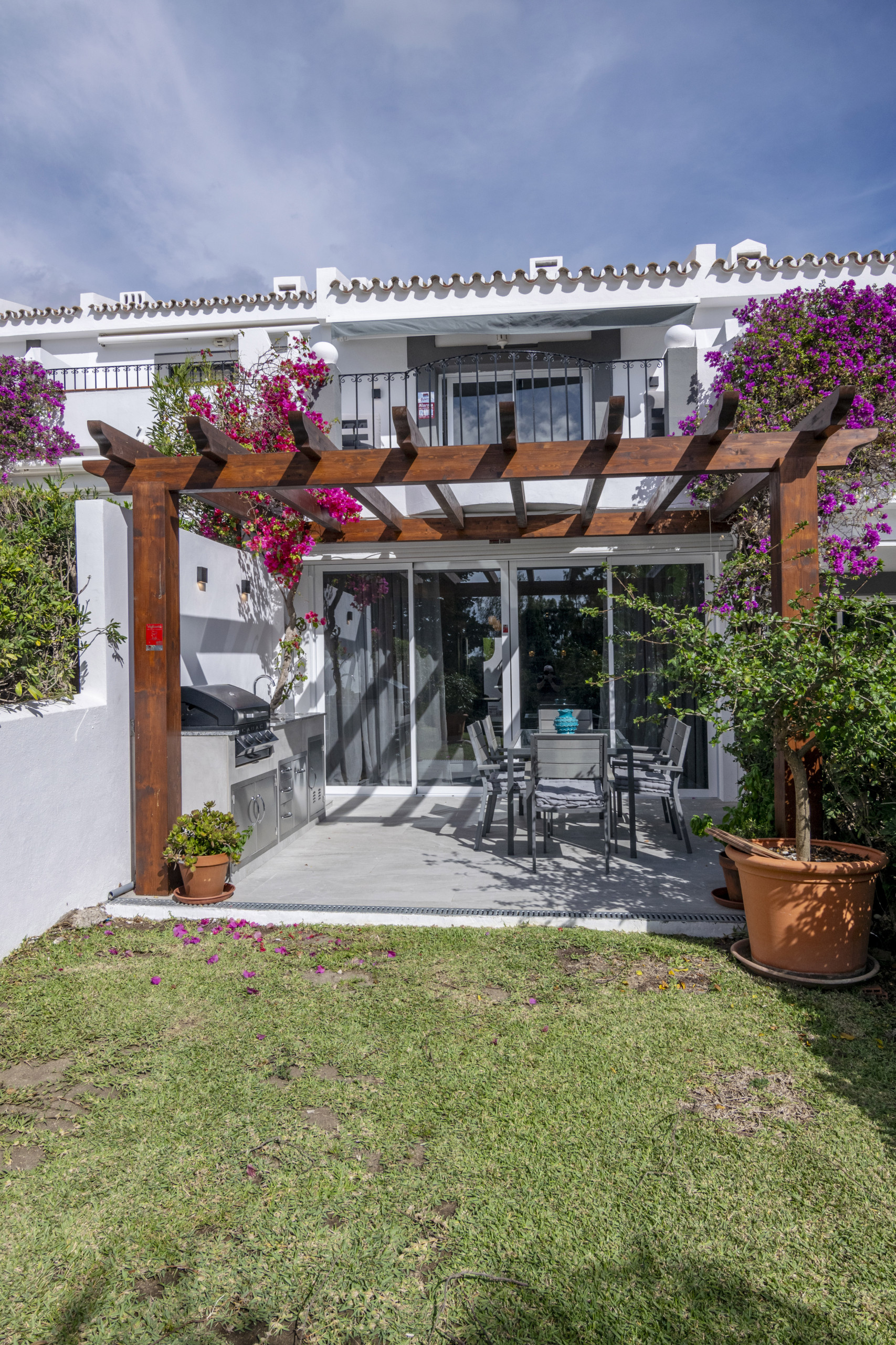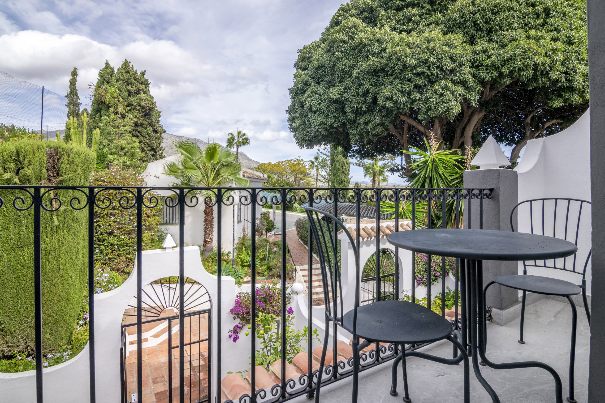 Esta es una unidad de 3 dormitorios. La propiedad tiene un dormitorio en la planta baja y dos arriba, el dormitorio principal tiene un pequeño balcón con sol de la mañana y vistas sobre el campo de golf, la emblemática montaña de La Concha y el mar Mediterráneo. Aqui se puede disfrutar del sol todo el dia y de la preciosa puesta de sol. Hay un pequeño jardín privado y amplia terraza con una cocina al aire libre y una barbacoa, con un montón de espacio para relajarse y comer todo esto situado en hermosos jardines comunitarios y una piscina con vistas hacia Aloha Golf, montañas todo el camino hasta el mar. La propiedad dispone de calefacción por suelo radiante en todas las habitaciones de la planta baja y en los baños.