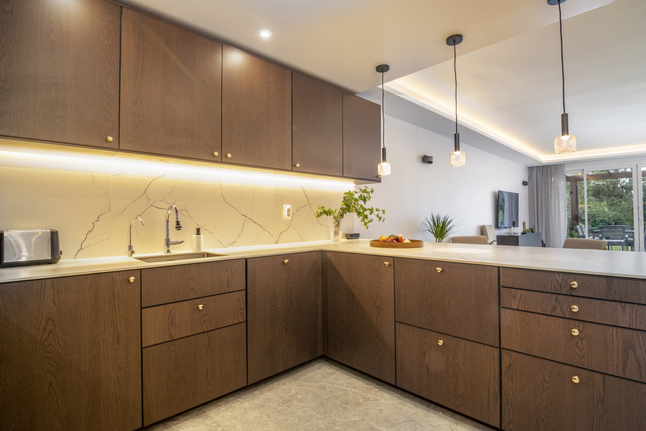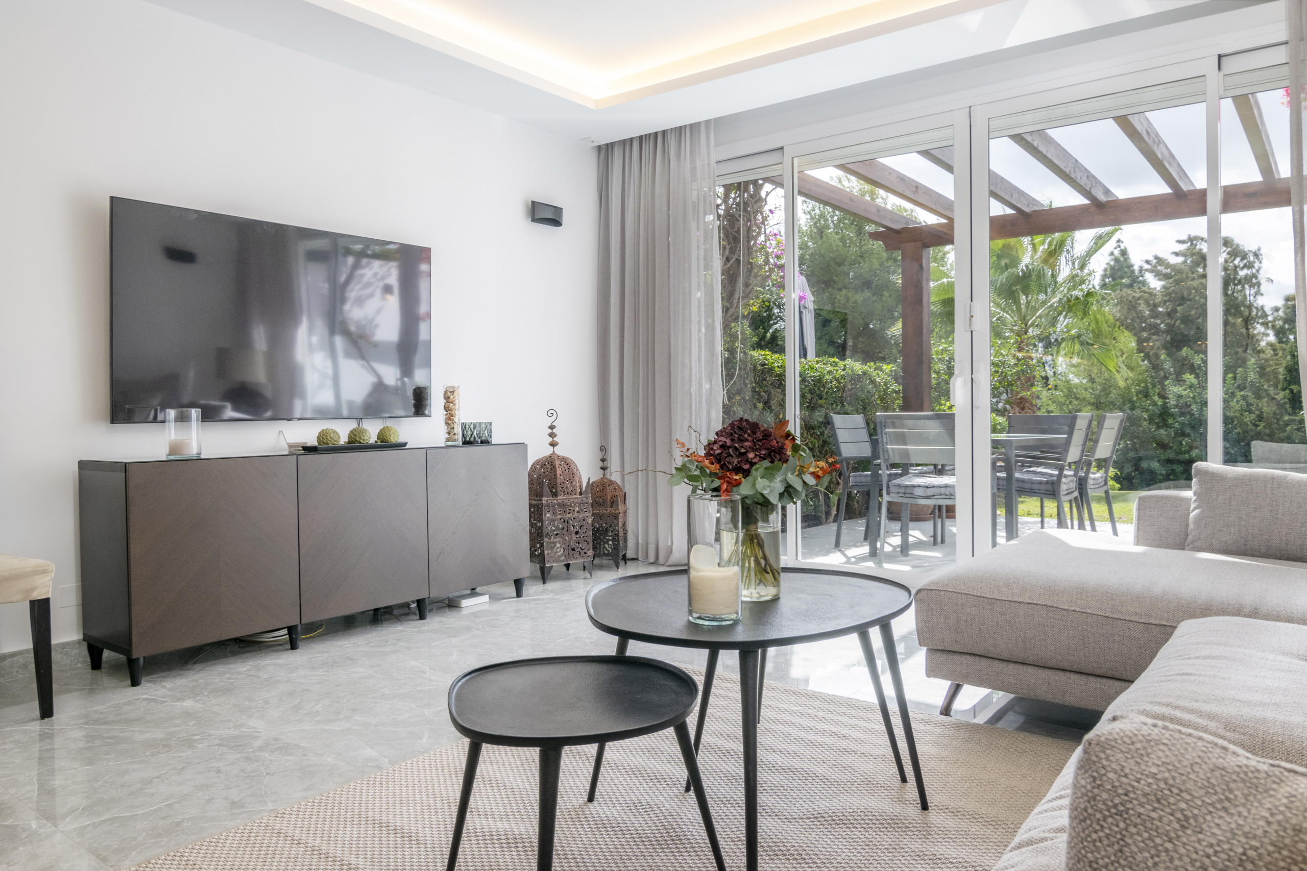 El área de estar tiene puertas plegables amplias que crean una vida interior-exterior perfectamente integrada. La terraza es simplemente increíble, ofreciendo áreas tanto cubiertas como abiertas para relajarse y disfrutar del sol. Disfrute de largas tardes de verano con una barbacoa, cene al aire libre, o relájese en el sofá exterior y la cama de día mientras absorbe el estilo de vida mediterráneo.