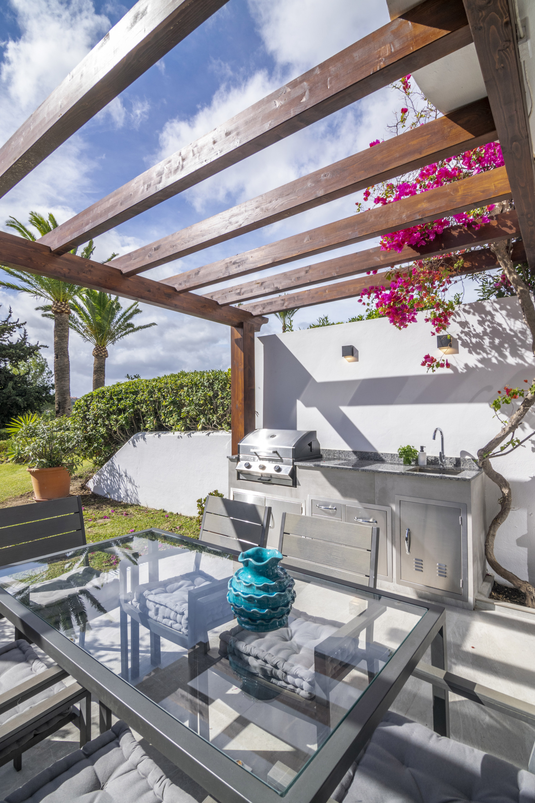 La comunidad de Las Pérgolas también ofrece excelentes comodidades en el lugar compartidas entre solo 18 casas, incluyendo una piscina, una cancha de tenis y estacionamiento techado bajo pérgola (calle), lo que hace su estancia aún más cómoda y conveniente.