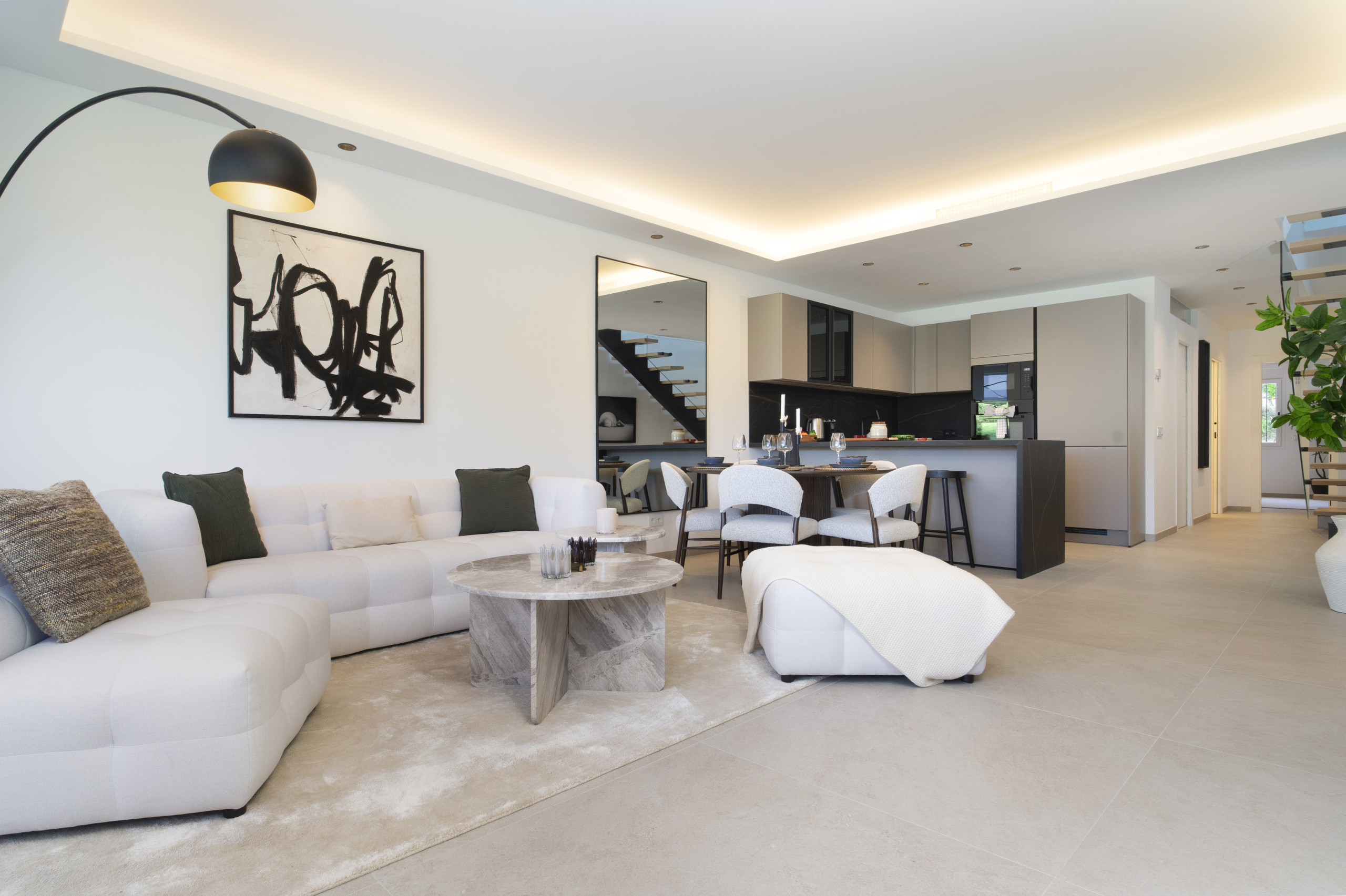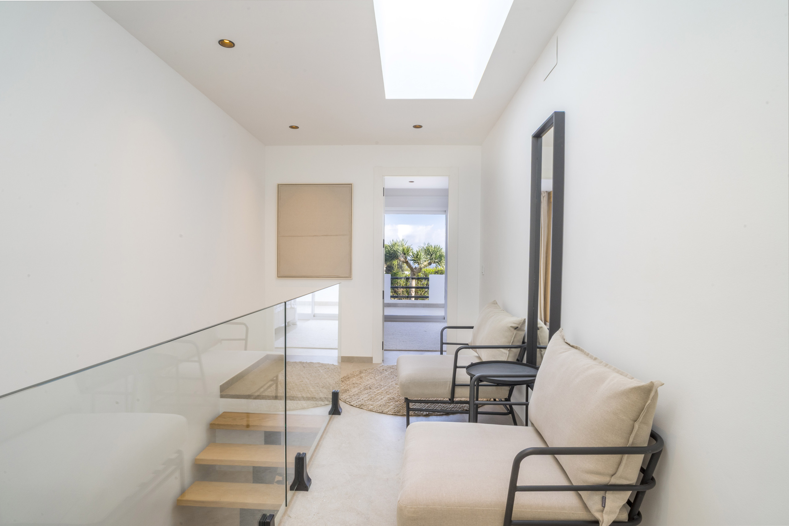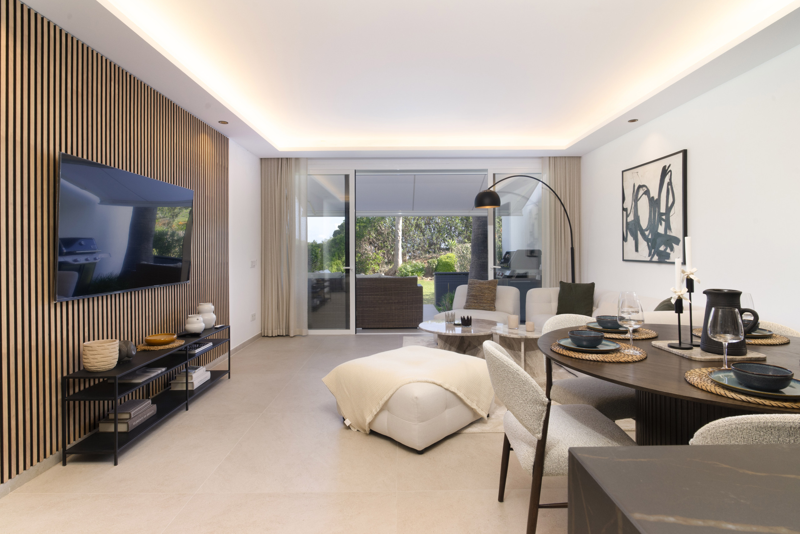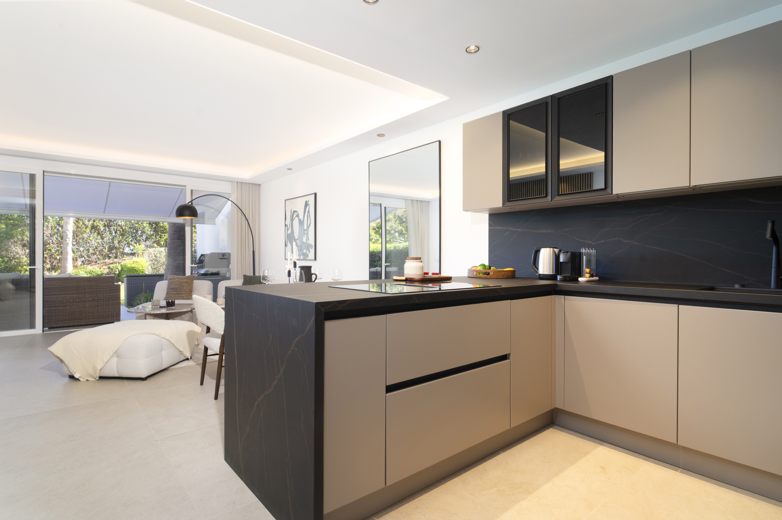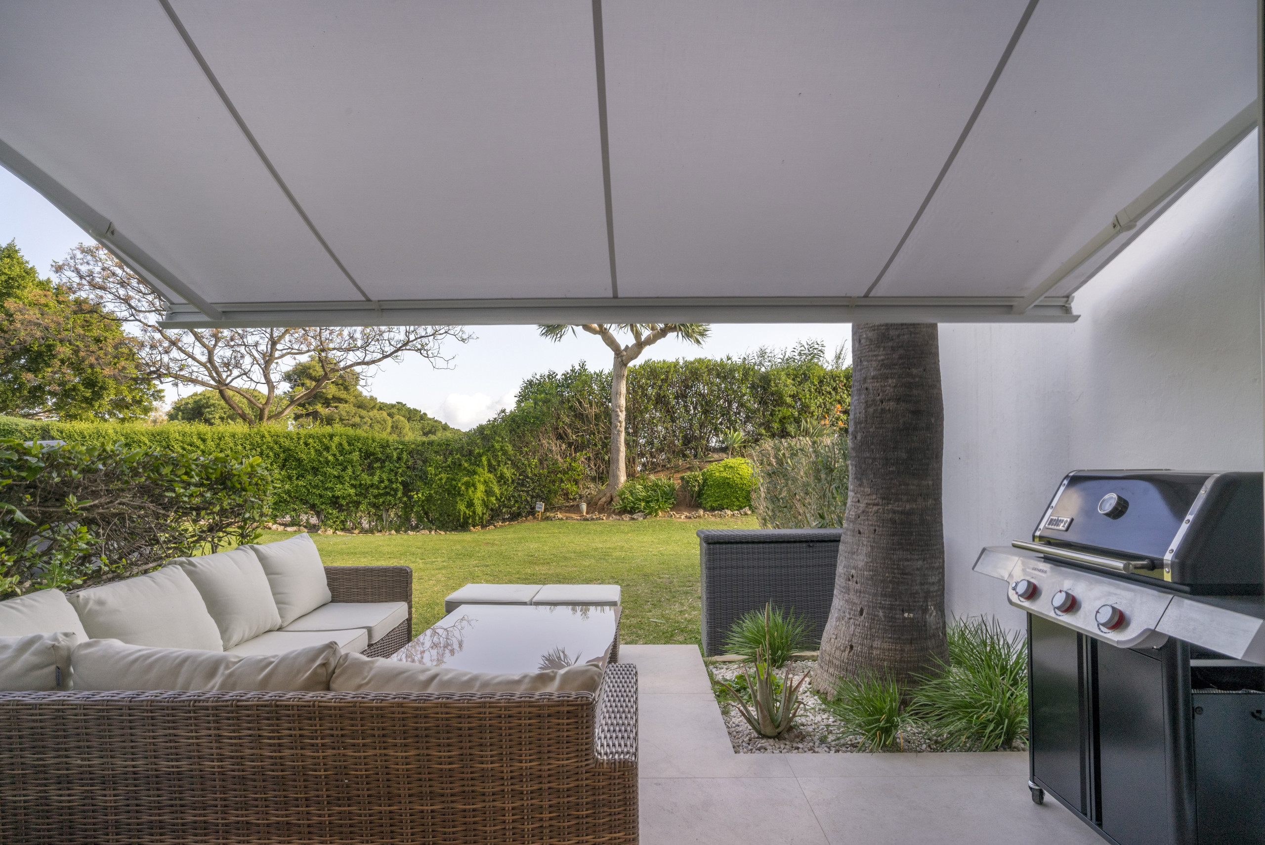 El área de estar tiene puertas plegables amplias que crean una vida interior-exterior perfectamente integrada. La terraza es simplemente increíble, ofreciendo áreas tanto cubiertas como abiertas para relajarse y disfrutar del sol. Disfrute de largas tardes de verano con una barbacoa, cene al aire libre, o relájese en el sofá exterior y la cama de día mientras absorbe el estilo de vida mediterráneo.