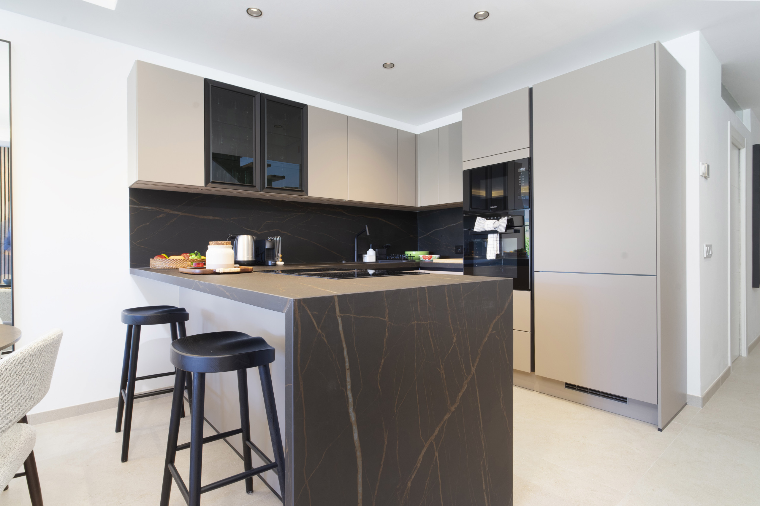 Al entrar, un encantador patio privado marca el tono. En el interior, la cocina moderna de planta abierta se integra perfectamente con el área de estar y comedor. También hay una habitación adicional conveniente con dos camas individuales en este nivel, ideal para niños o invitados (sin aire acondicionado en esta habitación, solo en la sala de estar, pero se proporcionan ventiladores silenciosos), y un tercer baño con ducha de paseo.