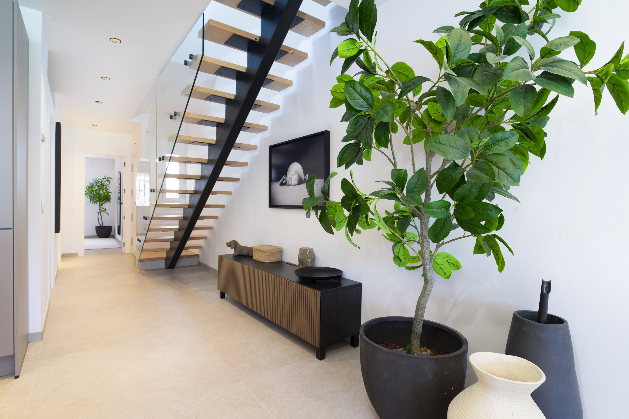 La propiedad está construida en dos plantas. Al entrar en la propiedad para encontrar una cocina moderna totalmente equipada con electrodomésticos de primera calidad. La sala de estar y comedor combinado es amplio y luminoso. Desde aquí hay acceso directo a la terraza cubierta y jardín privado. Subiendo las escaleras se encuentran los tres dormitorios. Dos de ellos tienen acceso a terrazas. También hay dos amplios cuartos de baño con ventanas, uno de ellos pertenece a la suite principal. Terraza orientada al norte con vistas a la montaña de Sierra Blanca y a las zonas comunitarias. La terraza principal tiene vistas hacia el sur, ideal para disfrutar del sol de Marbella. En la parte superior de la casa hay un solarium de 24m2 - ¡imagínese entretenerse aquí con amigos y familiares!