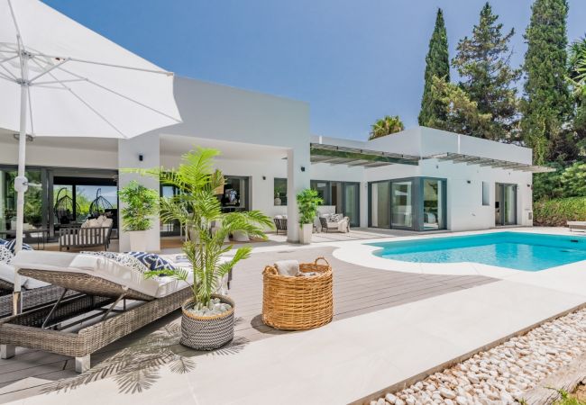 Moderna villa de cuatro dormitorios en el Valle del Golf disponible para alquiler vacacional, a pocos minutos en coche de Puerto Banús y la playa. Y a un corto trayecto en coche de una gran variedad de bares, restaurantes y supermercados.