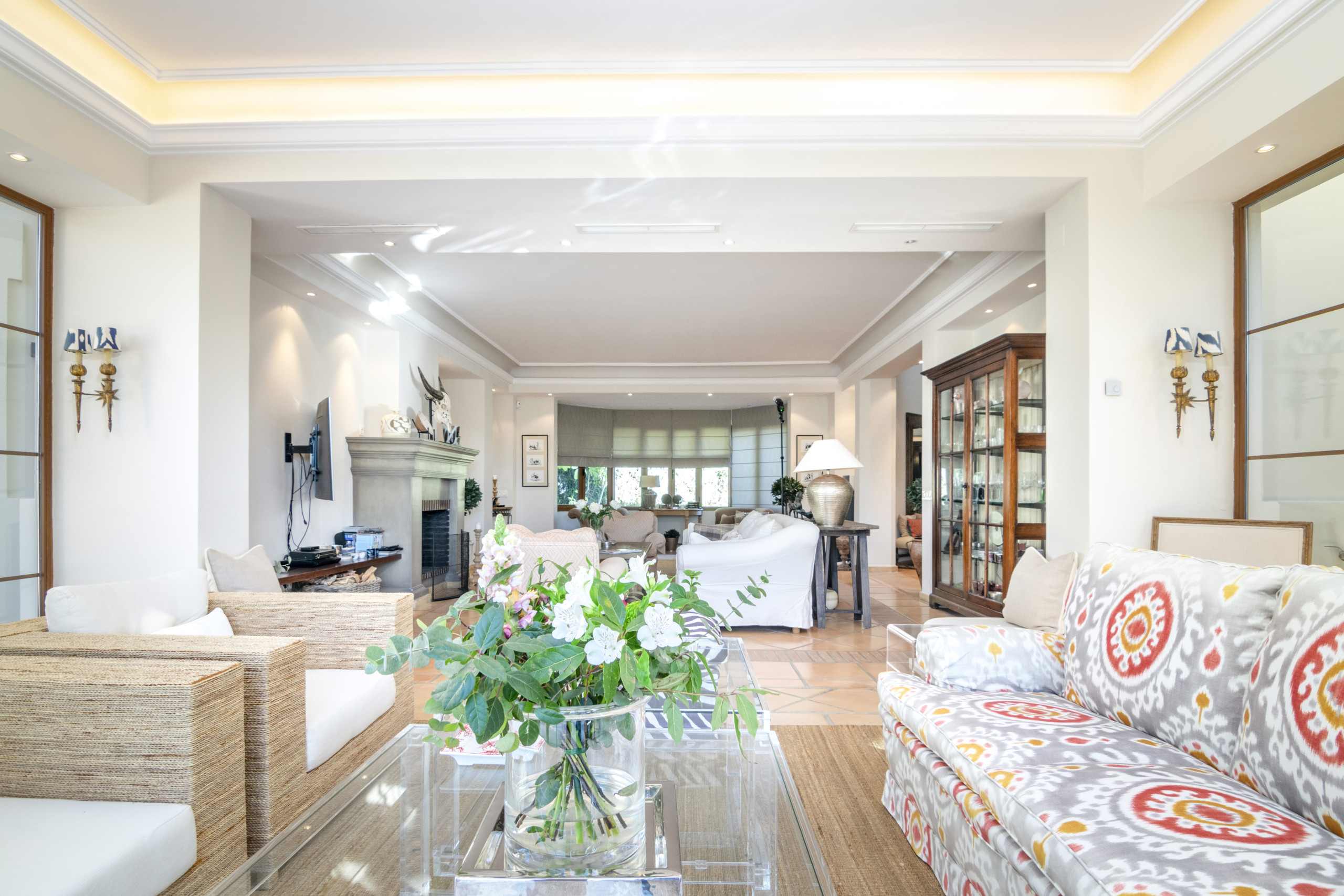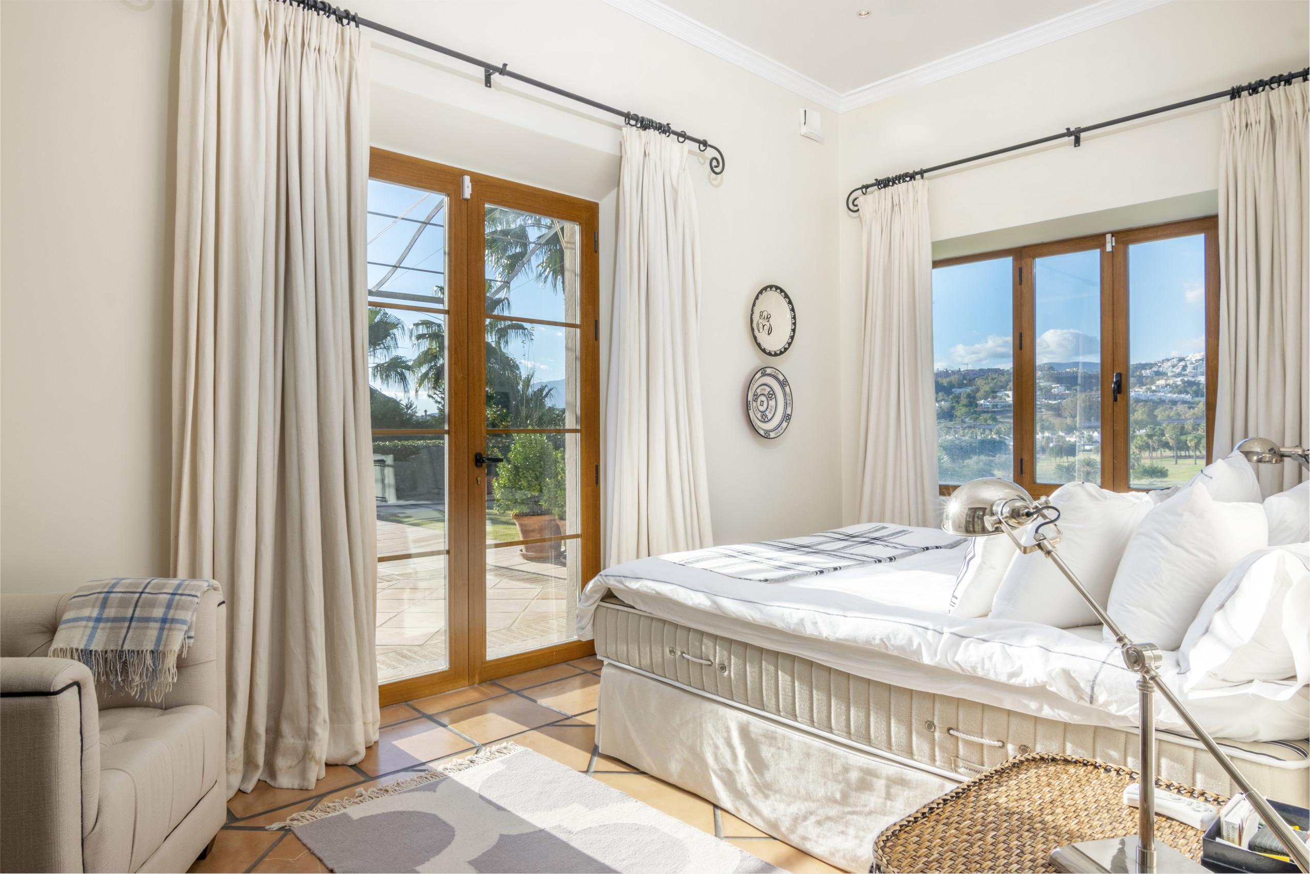 Ahora, la visita guiada: Al entrar en la casa principal encontrará un acogedor hall de entrada. A la izquierda se encuentra un aseo de invitados y la cocina con comedor que tiene acceso tanto a un patio con mesa de comedor en la parte trasera de la casa, así como la terraza y la zona de la piscina. En este lado de la casa también se encuentran dos dormitorios dobles con baños en-suite. Tomando a la derecha en la entrada conduce a la amplia sala de estar que se presenta con buen gusto dando una sensación cálida y como en casa. Esta dirección le lleva a otros dos dormitorios con acceso directo a la terraza y la zona de la piscina que significa hermosa luz natural entra a través de estas habitaciones. Ambos dormitorios tienen baños en-suite. La planta superior está dedicada a la suite principal, con vestidor y baño en-suite y acceso a una preciosa terraza con vistas al golf.