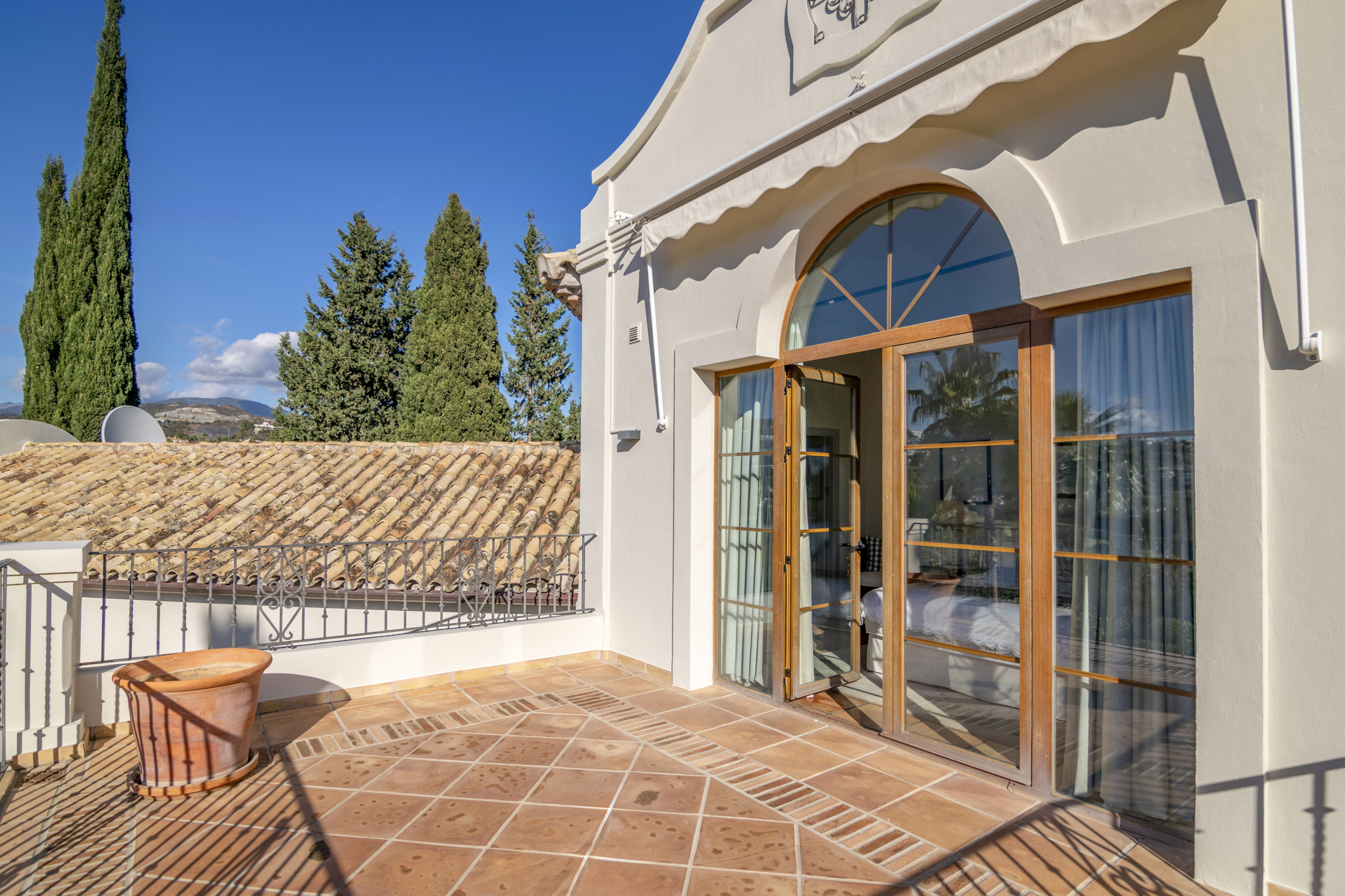 En la planta superior, el dormitorio principal y los dormitorios adicionales ofrecen lujosos baños privados y acceso a una generosa terraza, perfecta para tomar el sol. El dormitorio principal con baño en suite presume de impresionantes vistas a los árboles circundantes, una gran terraza, un amplio vestidor y un lujoso cuarto de baño completo con ducha y bañera.
