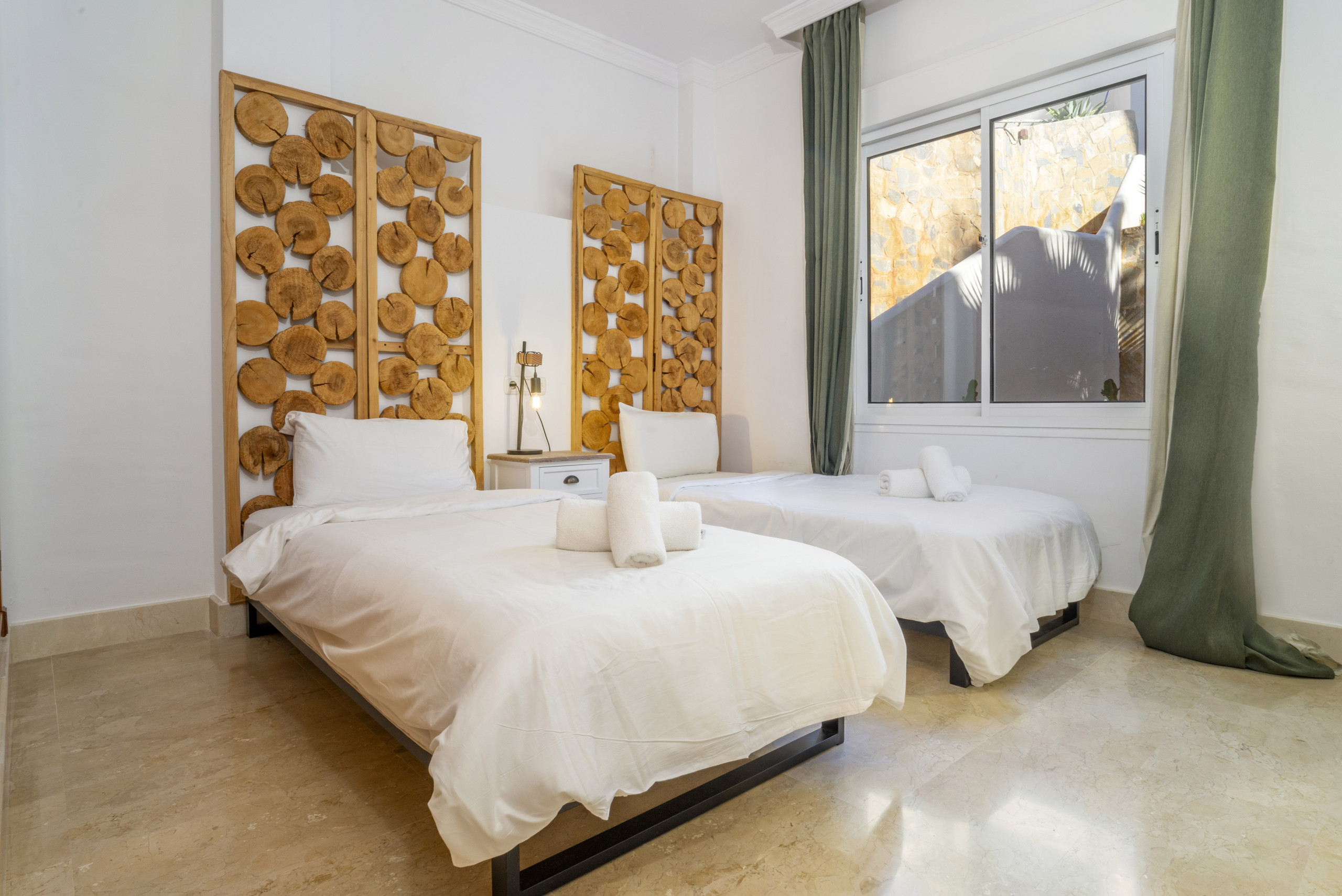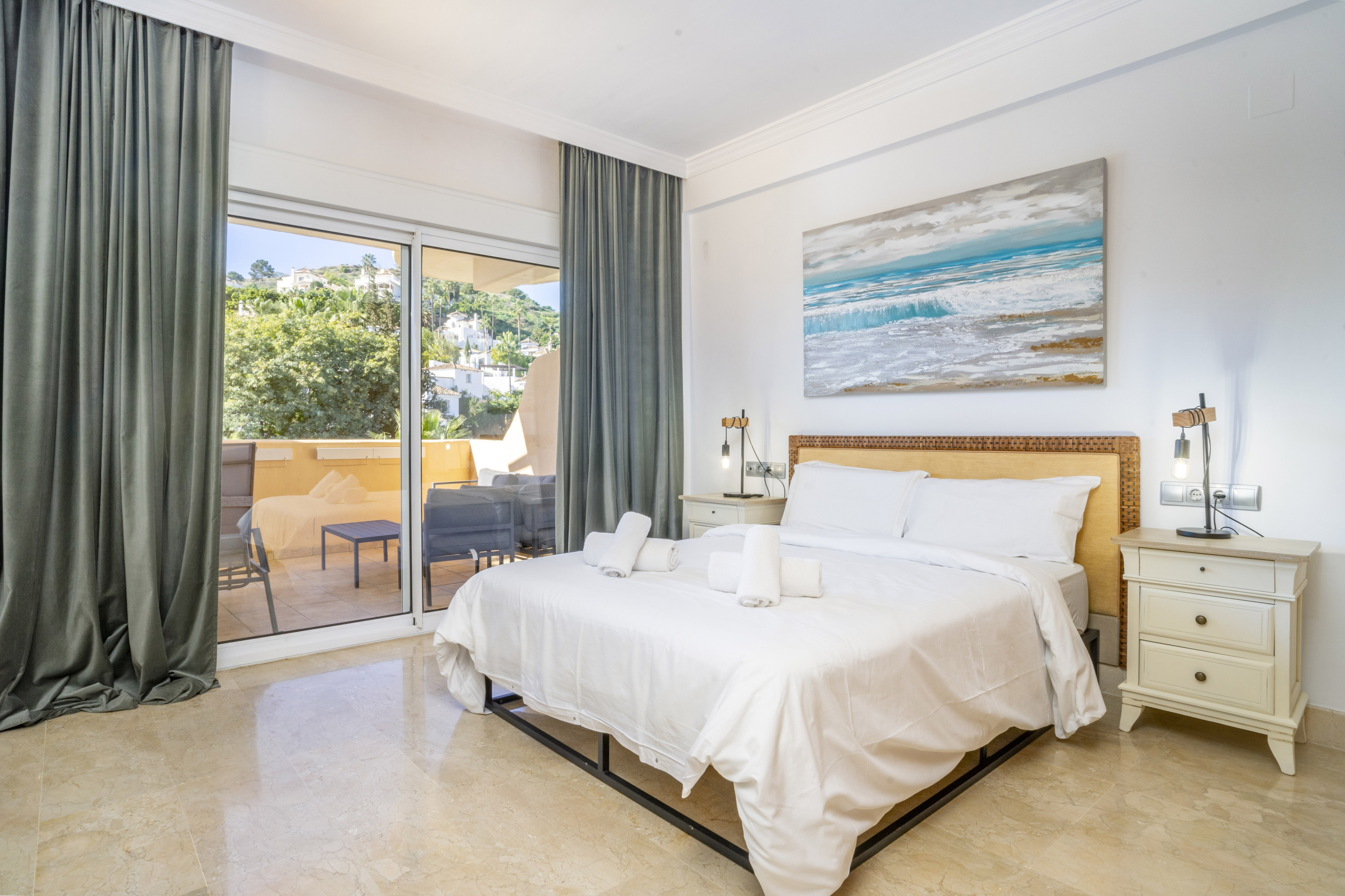 La suite principale dispose d'un lit king-size, d'une salle de bain attenante et d'un accès à la terrasse, tandis que la deuxième chambre est confortable et meublée avec deux lits.