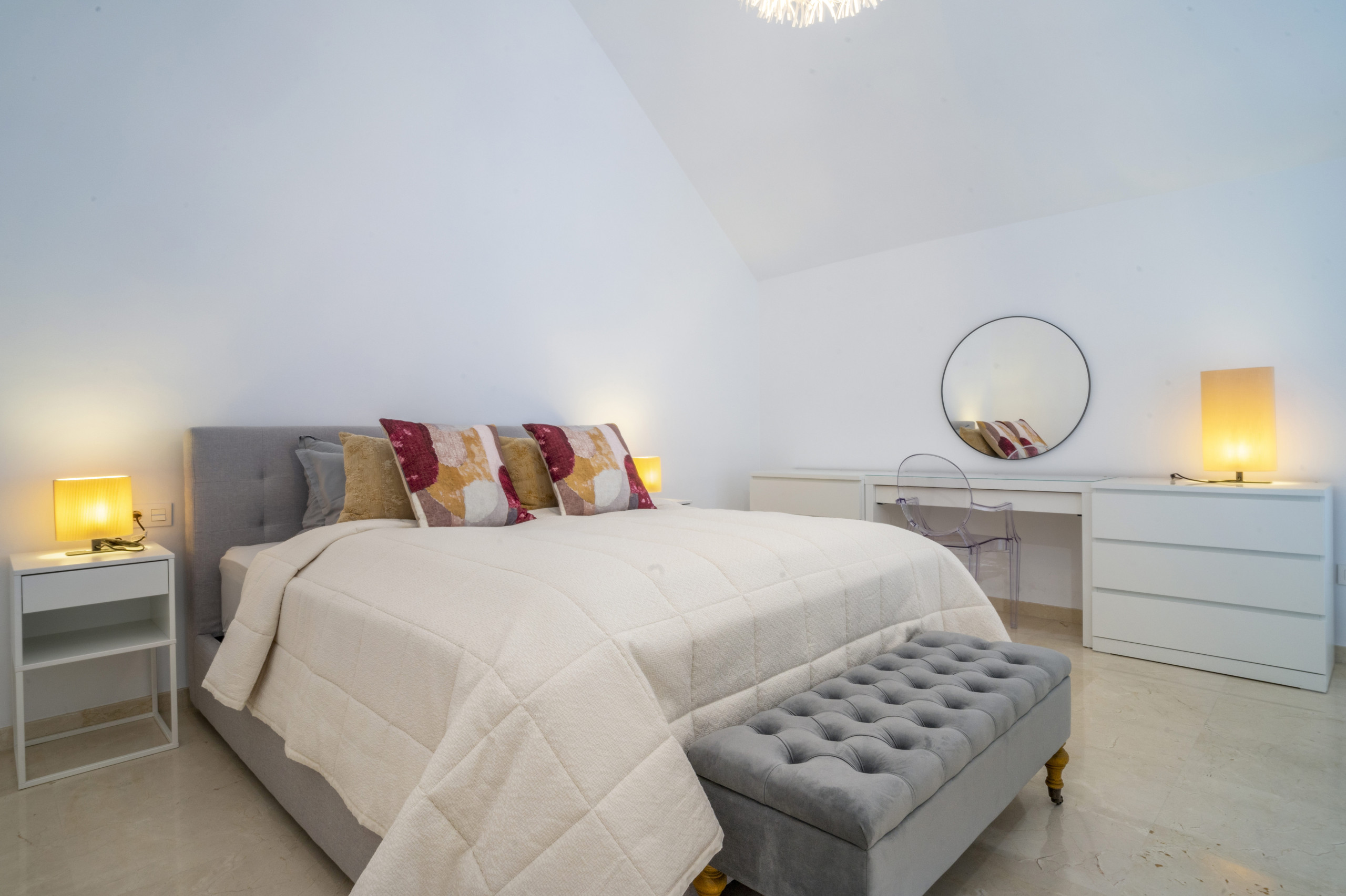 La disposition de ce penthouse est soigneusement conçue pour maximiser à la fois l'intimité et le confort quotidien. La suite principale privée est située à l'étage supérieur, offrant une retraite idéale. Elle comprend un grand dressing avec un espace de rangement généreux et une terrasse privée où vous pouvez vous détendre tout en profitant d'une vue partielle sur la mer.