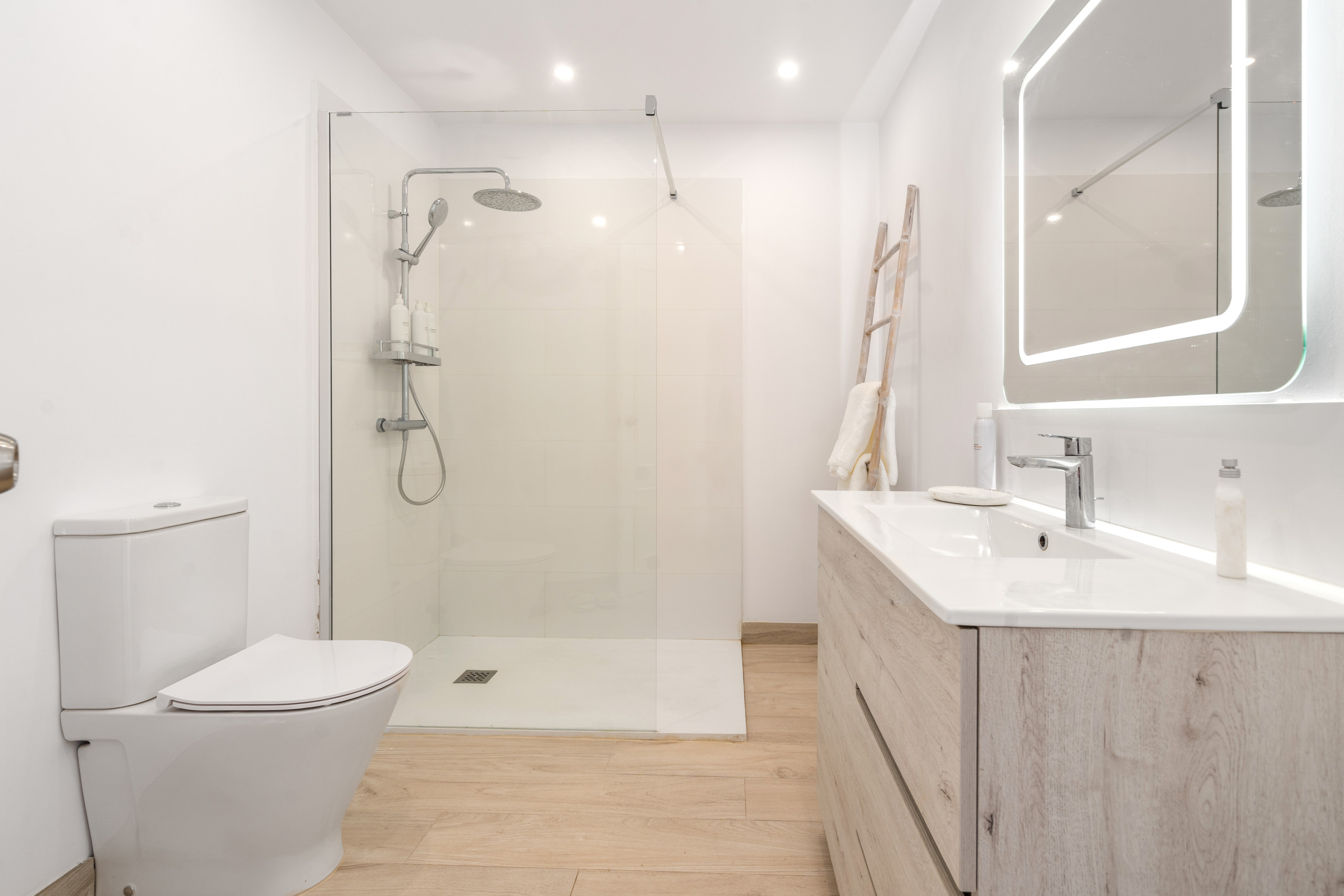 En entrant, une terrasse privée charmante donne le ton. À l'intérieur, la cuisine moderne à plan ouvert se fond harmonieusement avec le salon et la salle à manger. Il y a aussi une chambre supplémentaire pratique avec deux lits simples à ce niveau, idéale pour les enfants ou les invités (pas de climatisation dans cette chambre, uniquement dans le salon, mais des ventilateurs silencieux sont fournis), et une troisième salle de bain avec douche à l'italienne.