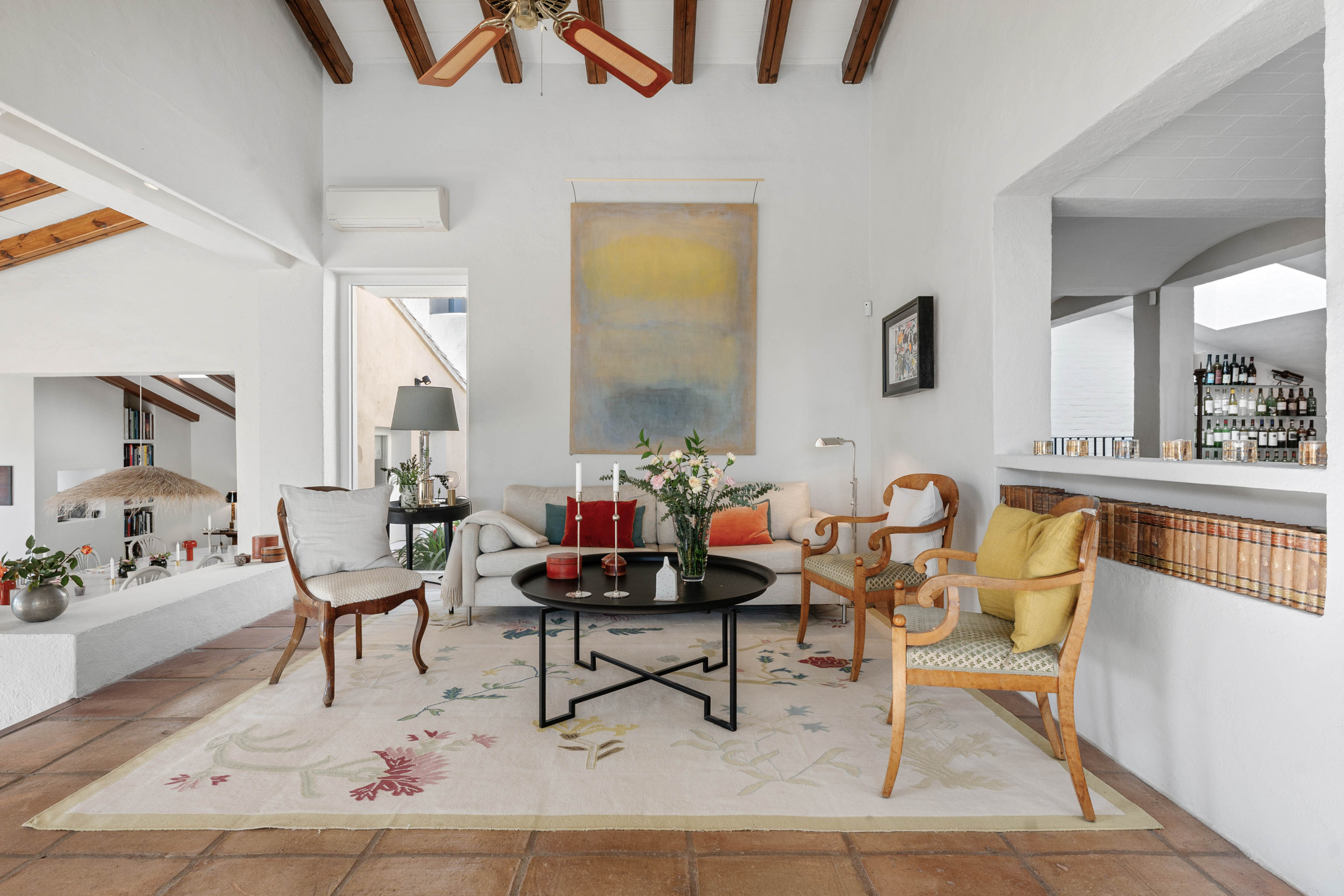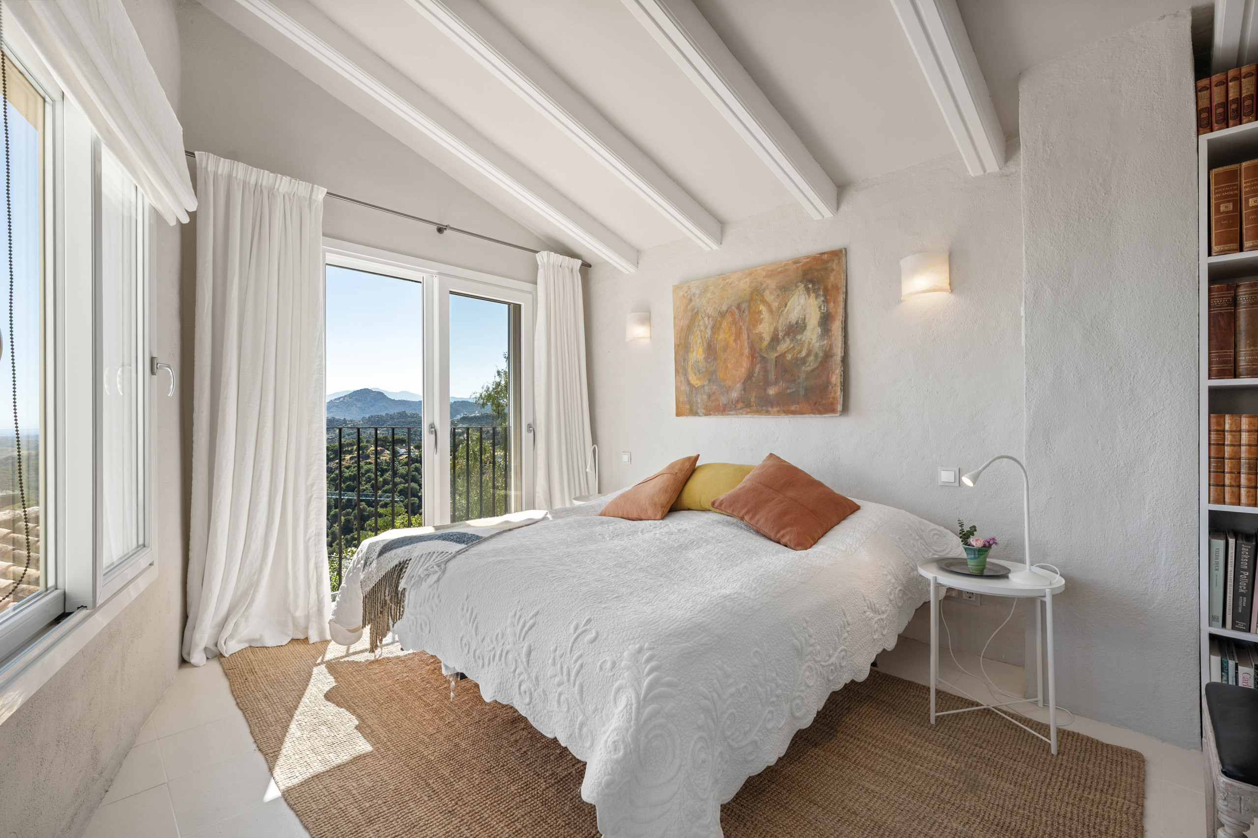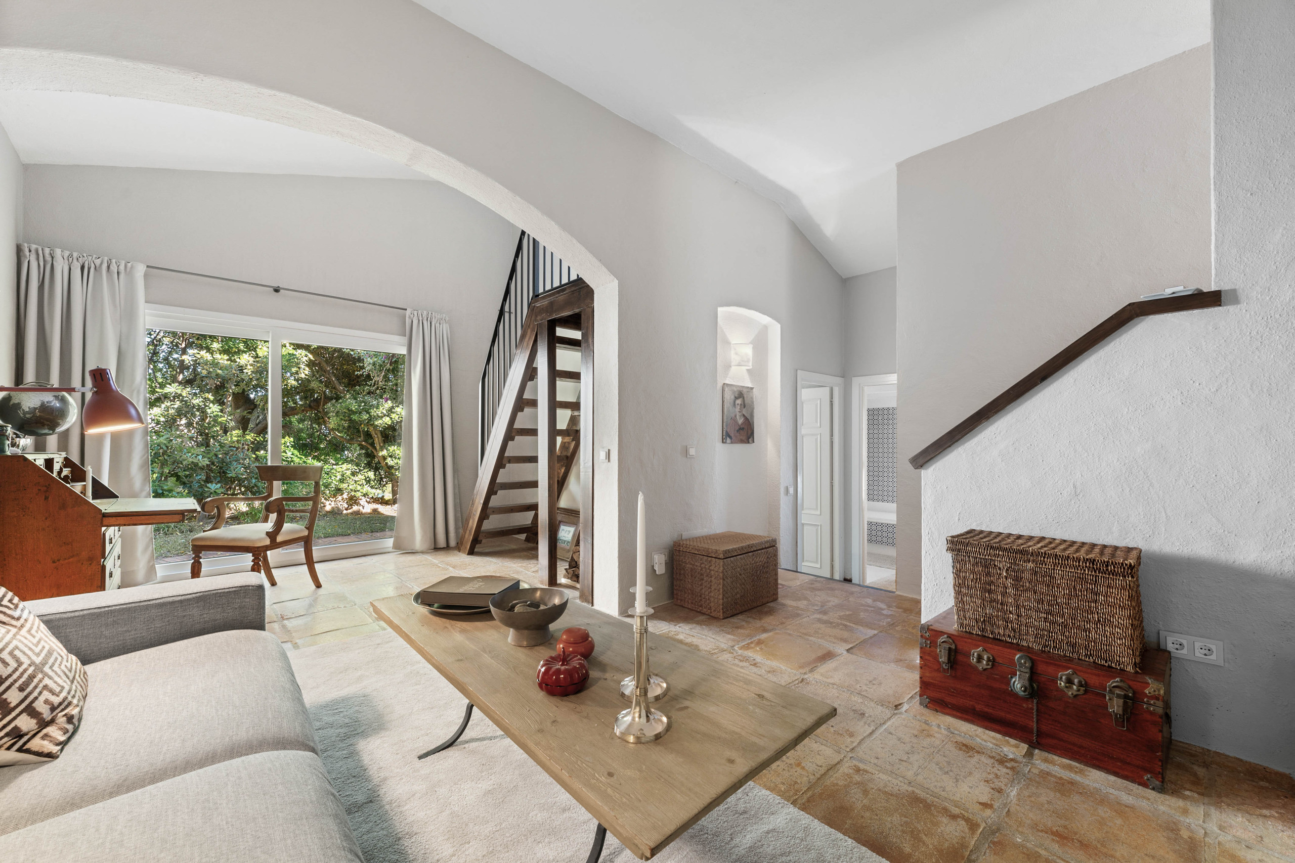 La maison principale vous accueille avec une bibliothèque charmante, vous invitant à vous détendre avec un livre dans un environnement paisible. Au bout du couloir, vous découvrirez deux chambres doubles élégantes et un salon douillet, chaque coin étant conçu pour des moments de tranquillité ou des conversations partagées. En montant les escaliers, vous trouverez la chambre principale avec sa propre salle de bain attenante, ainsi qu'un magnifique salon qui offre les meilleures vues de la maison — l'endroit parfait pour se détendre et profiter de l'environnement paisible.