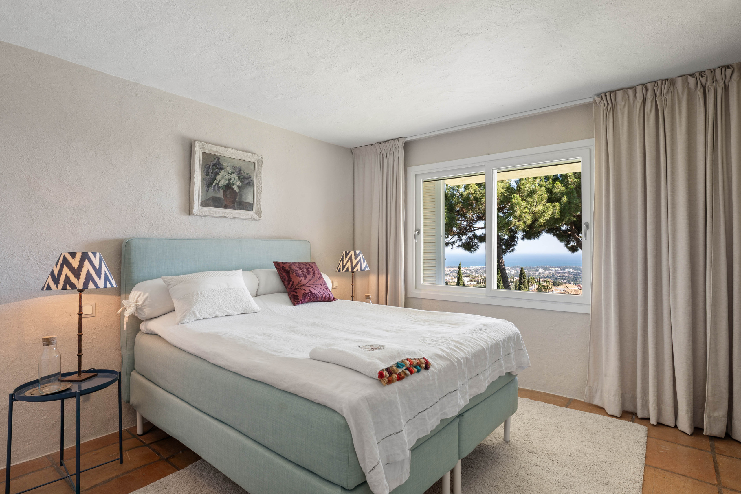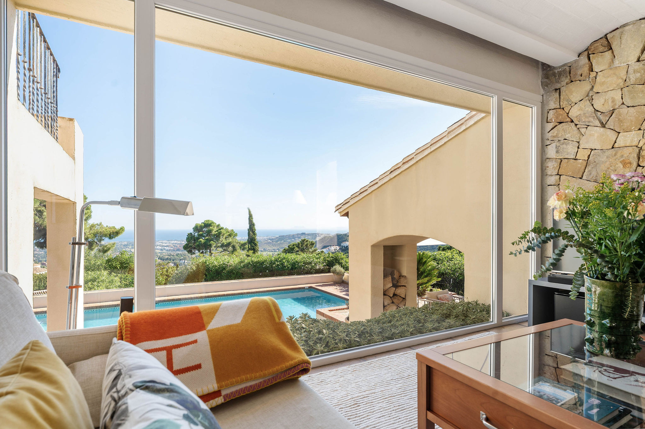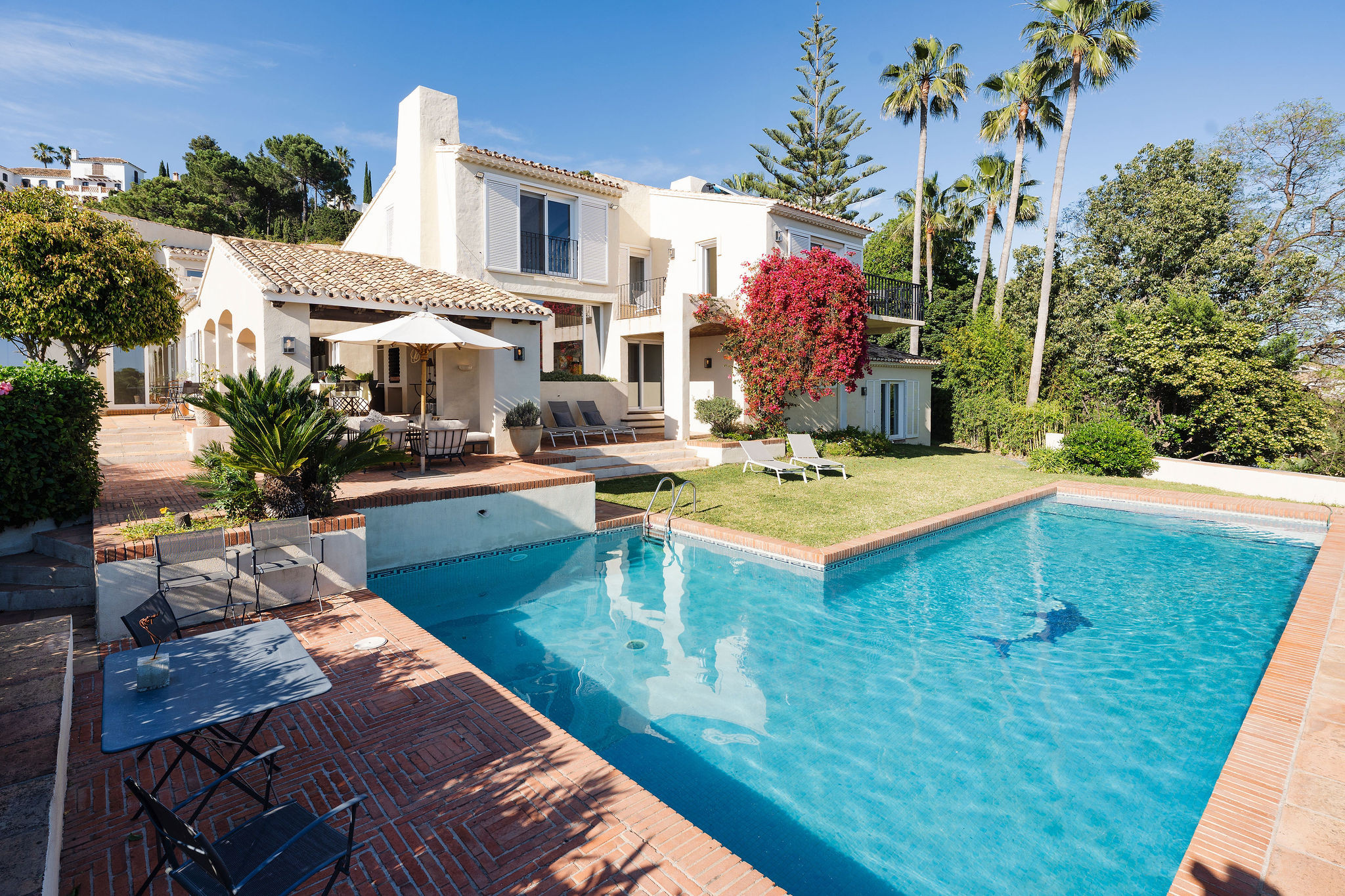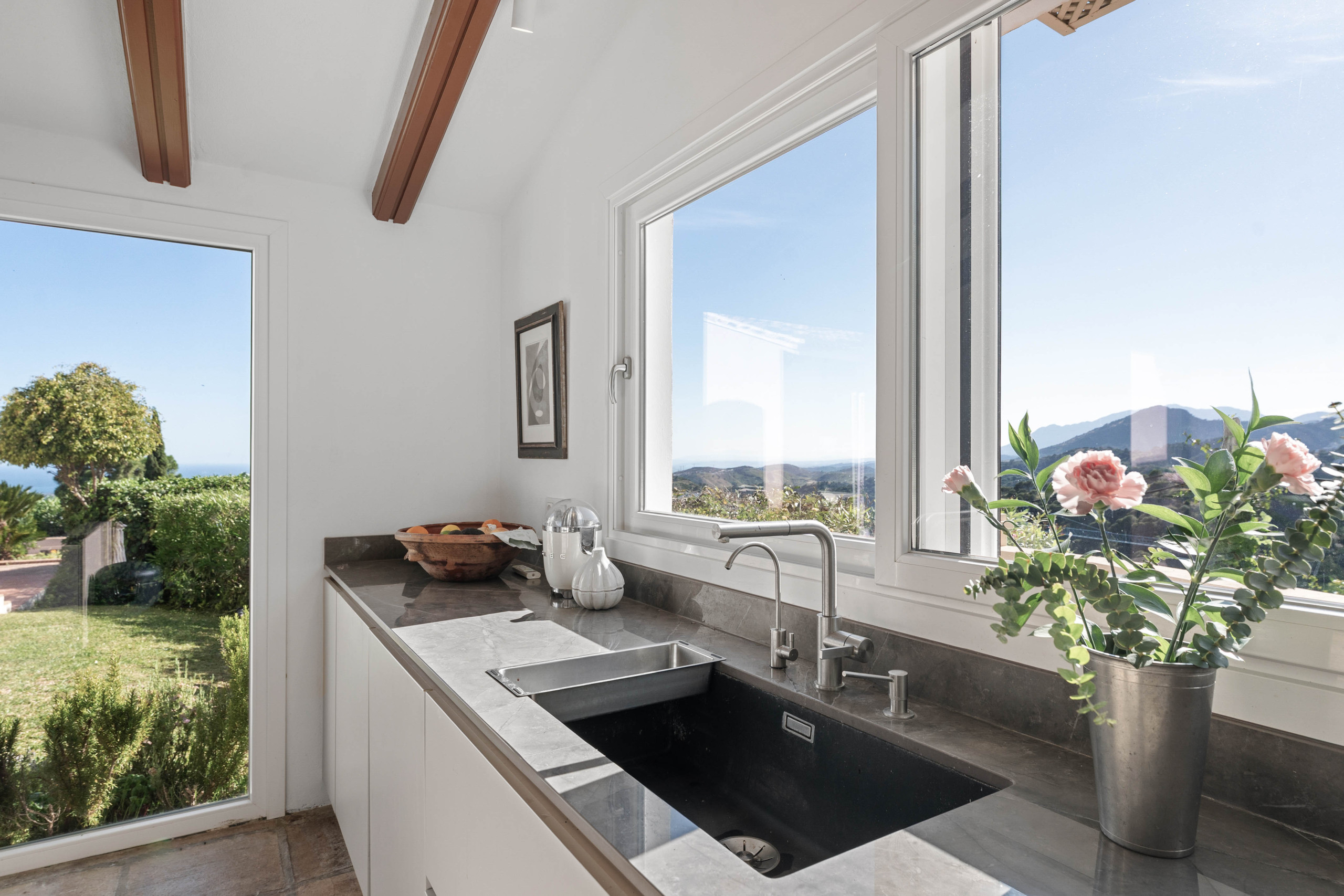 Parfait pour plusieurs familles ou groupes plus importants, la villa dispose de 5 chambres et est intelligemment divisée en trois espaces de vie distincts – deux maisons d'hôtes indépendantes et la résidence principale. Chacune des maisons d'hôtes est soigneusement équipée de sa propre cuisine, espace de vie, salle à manger et chambre, offrant aux invités la rare opportunité de profiter de la sensation d'avoir leur propre appartement privé au sein du même domaine. Que vous prépariez le petit-déjeuner dans votre propre cuisine ou que vous sortiez pour profiter des vues magnifiques, chaque espace ressemble à un refuge à part entière.