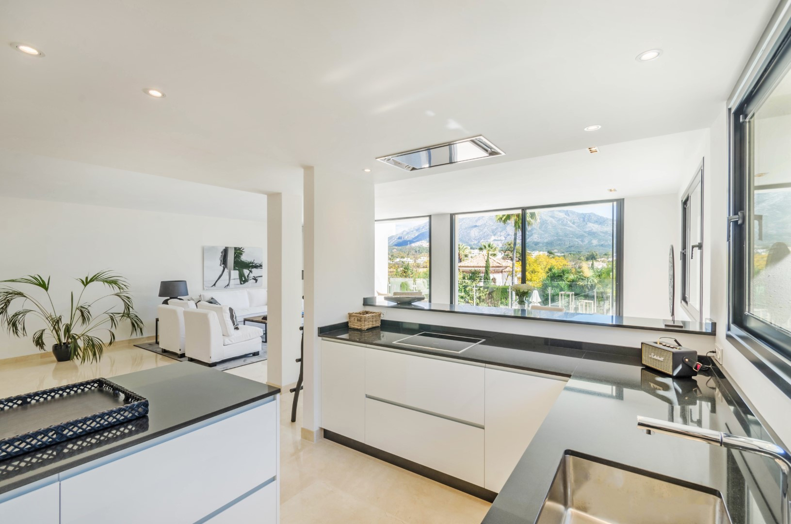 Rénovée selon les plus hauts standards, la propriété a été conçue sur mesure pour créer une maison contemporaine luxueuse. Cette villa est commodément répartie sur un seul niveau pour un accès facile (quelques marches à l'entrée). Elle offre beaucoup de lumière et des vues impressionnantes sur la montagne La Concha et le parcours de golf Las Brisas. En entrant, vous trouverez des toilettes d'invités sur la gauche. Sur le côté droit se trouve une chambre double avec salle de bain attenante. À gauche de l'entrée, vous trouverez trois chambres supplémentaires. Deux d'entre elles partagent une salle de bain (une chambre avec lits simples et une autre avec un lit double). La chambre principale est spacieuse, présentée avec goût et offre des vues magnifiques avec une salle de bain attenante. Tout droit à l'entrée se trouve l'espace ouvert comprenant le salon, une cuisine élégante avec des appareils Miele/Neff et une zone de salle à manger. De grandes portes coulissantes en verre de sécurité dans le salon et la salle à manger donnent sur un espace de terrasse fantastique avec une zone de repas et de détente extérieure. Il ne pourrait pas y avoir de meilleur endroit pour profiter pleinement de vos vacances avec vos proches ! Quelques marches descendent vers le jardin, la zone barbecue et la piscine reconnaissable. Les jardins paysagers sont équipés d'un système d'irrigation automatique et sont magnifiquement illuminés la nuit.