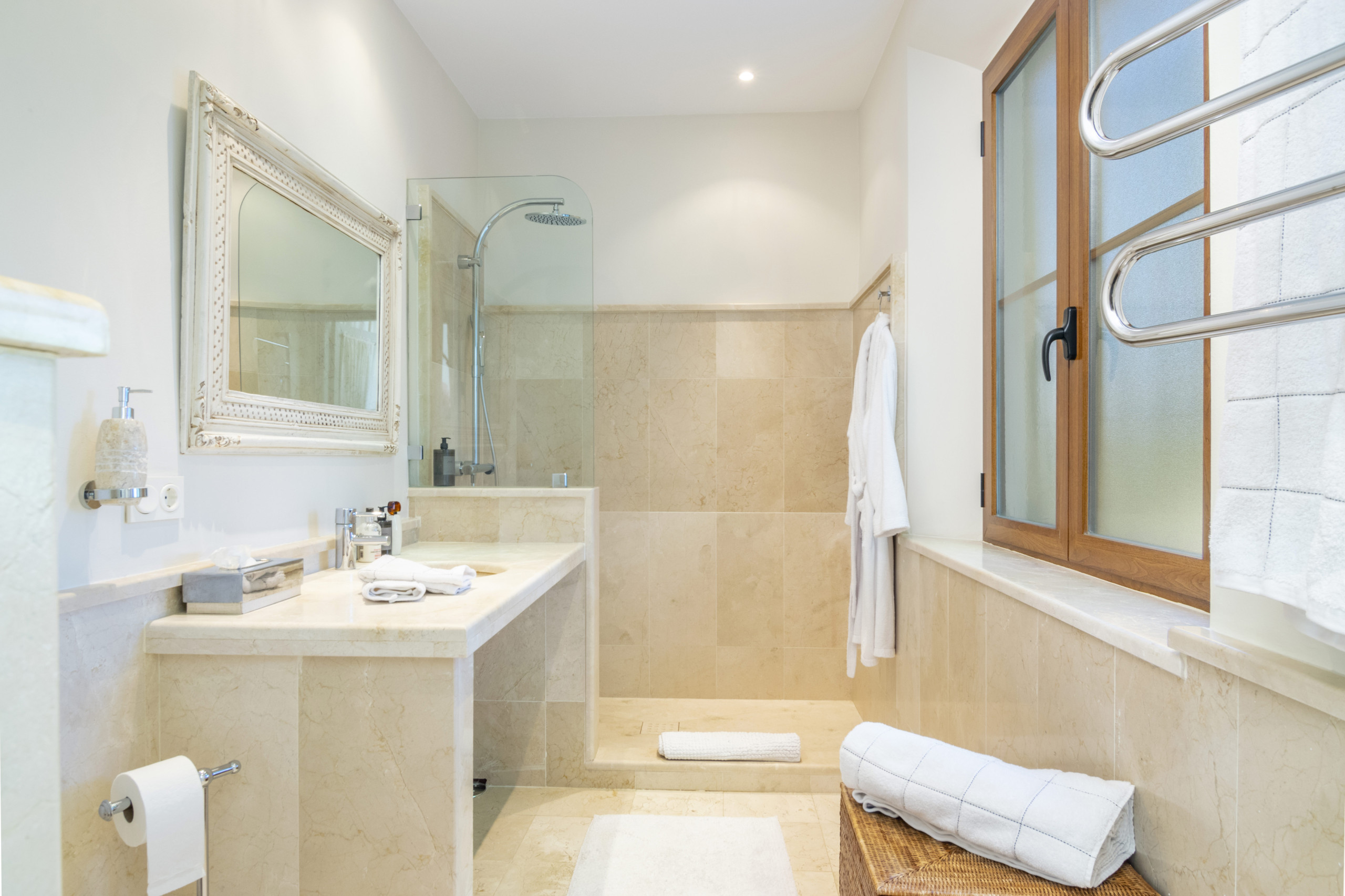 À l'étage, la chambre principale et les chambres supplémentaires offrent des salles de bains privées luxueuses et un accès à une terrasse généreuse, parfaite pour profiter du soleil. La chambre principale avec salle de bain attenante offre une vue imprenable sur les arbres environnants, une grande terrasse, un dressing spacieux et une salle de bain luxueuse comprenant à la fois une douche et une baignoire.