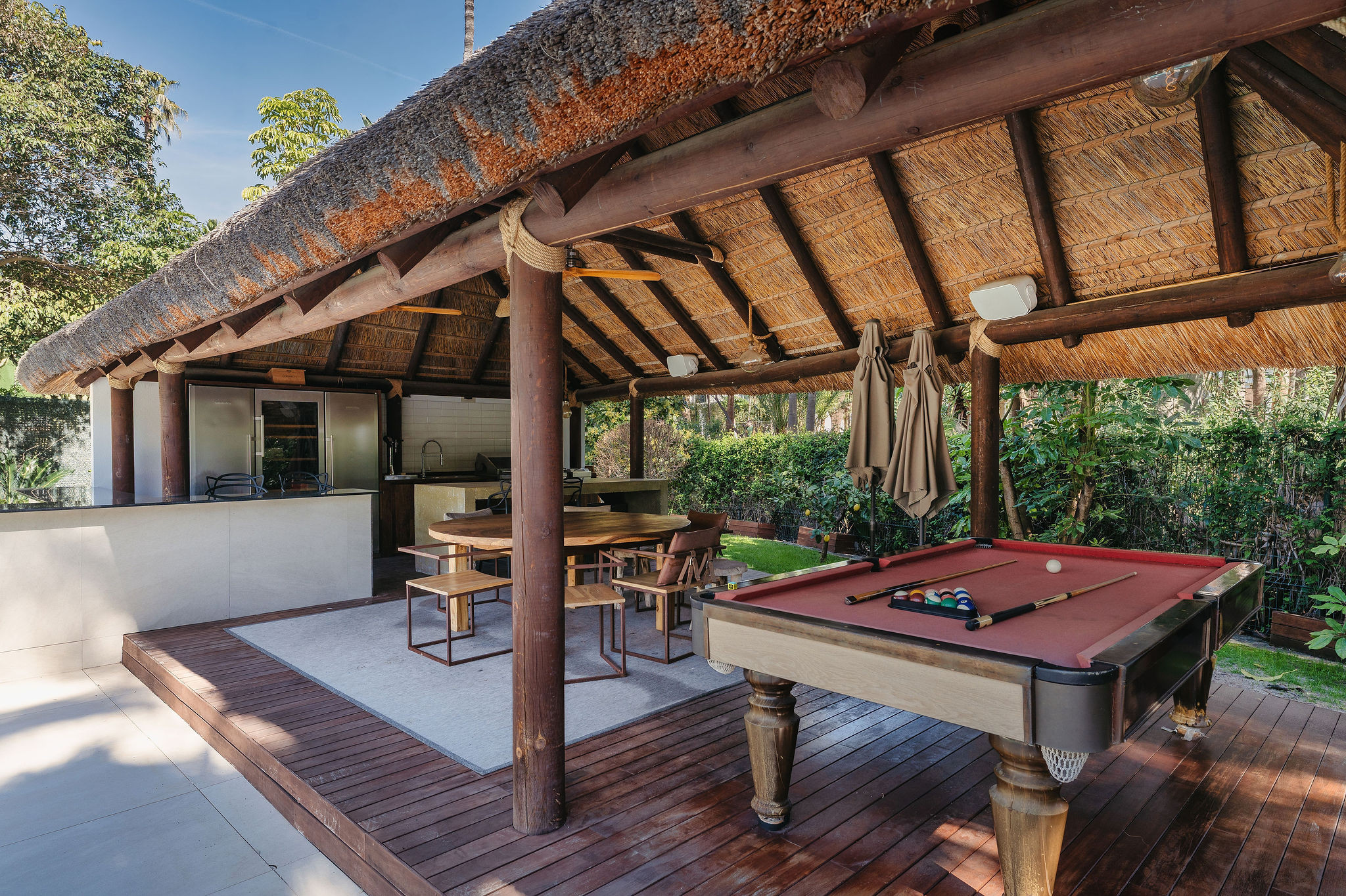 La vie en plein air est tout aussi spectaculaire : une longue table pour 14 convives, une piscine scintillante, un gazebo ombragé pour se détendre, et un espace salon confortable pour des journées paresseuses et baignées de soleil. Chaque coin de Villa Las Brisas a été conçu pour combiner style, confort et le mode de vie méditerranéen ultime.