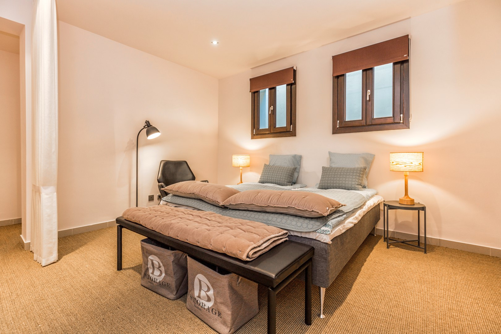 Au sous-sol, il y a une chambre double et un espace de couchage supplémentaire avec un rideau de séparation - veuillez noter que cet espace n'est pas privé, il conviendrait donc aux jeunes familles avec des enfants. Les deux espaces partagent une salle de bains. Une buanderie et un débarras se trouvent au même étage.