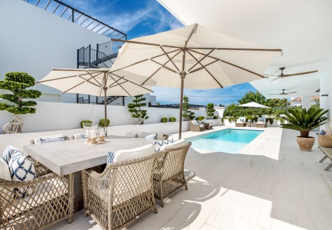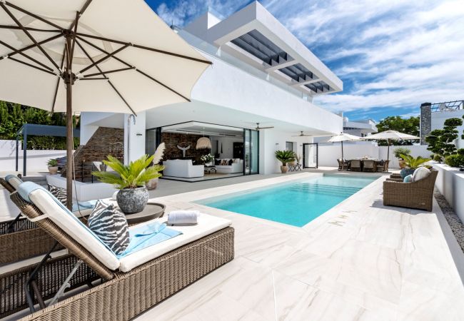 Villa à San Pedro de Alcántara qui possède 5 chambre(s) et Capacité pour 10 personnes. Logement de 288 m². Elle dispose de clôture, terrasse, lave-linge, barbecue, accès internet (wifi), sèche-cheveux, balcon, alarme, chauffage pompe à chaleur, climatisation dans tout le logement, piscine privée, piscine chauffée privée, parking couvert, TV, tv satellite (Langues: Espagnol, Anglais, Allemand, Hollandais, Français, Suédois, Norvégien).La cuisine, est équipée avec réfrigérateur, micro-ondes, four, congélateur, lave-vaisselle, vaisselle/couverts, ustensiles/cuisine, cafetière, grille pain, bouilloire et presse-agrumes.