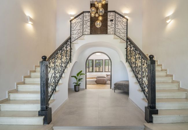 Cette villa dispose de 7 chambres, dont 5 chambres doubles dans la maison principale et 2 à l'extérieur. La maison est conçue dans un esprit de confort et de style scandinave. Les matériaux et le mobilier utilisés donnent une impression de chaleur avec une touche de modernité dès l'entrée. Un portail et une allée vous mènent à la maison principale. Devant la porte d'entrée se trouve une magnifique terrasse avec un coin salon et une vue imprenable sur la piscine et la vallée. En entrant par la porte principale, vous pénétrez dans le grand salon avec un double espace salon et une cheminée traditionnelle, qui donne un caractère chaleureux à l'espace. De chaque côté de la salle de séjour, il y a deux chambres doubles présentées avec goût (deux chambres partagent une salle de bains). Derrière le salon, vous trouverez le deuxième espace salon et l'accès à la cuisine moderne équipée de tous les appareils électroménagers dont vous pourriez avoir besoin. L'escalier double mène à la superbe chambre principale avec salle de bains privative et terrasse privée.