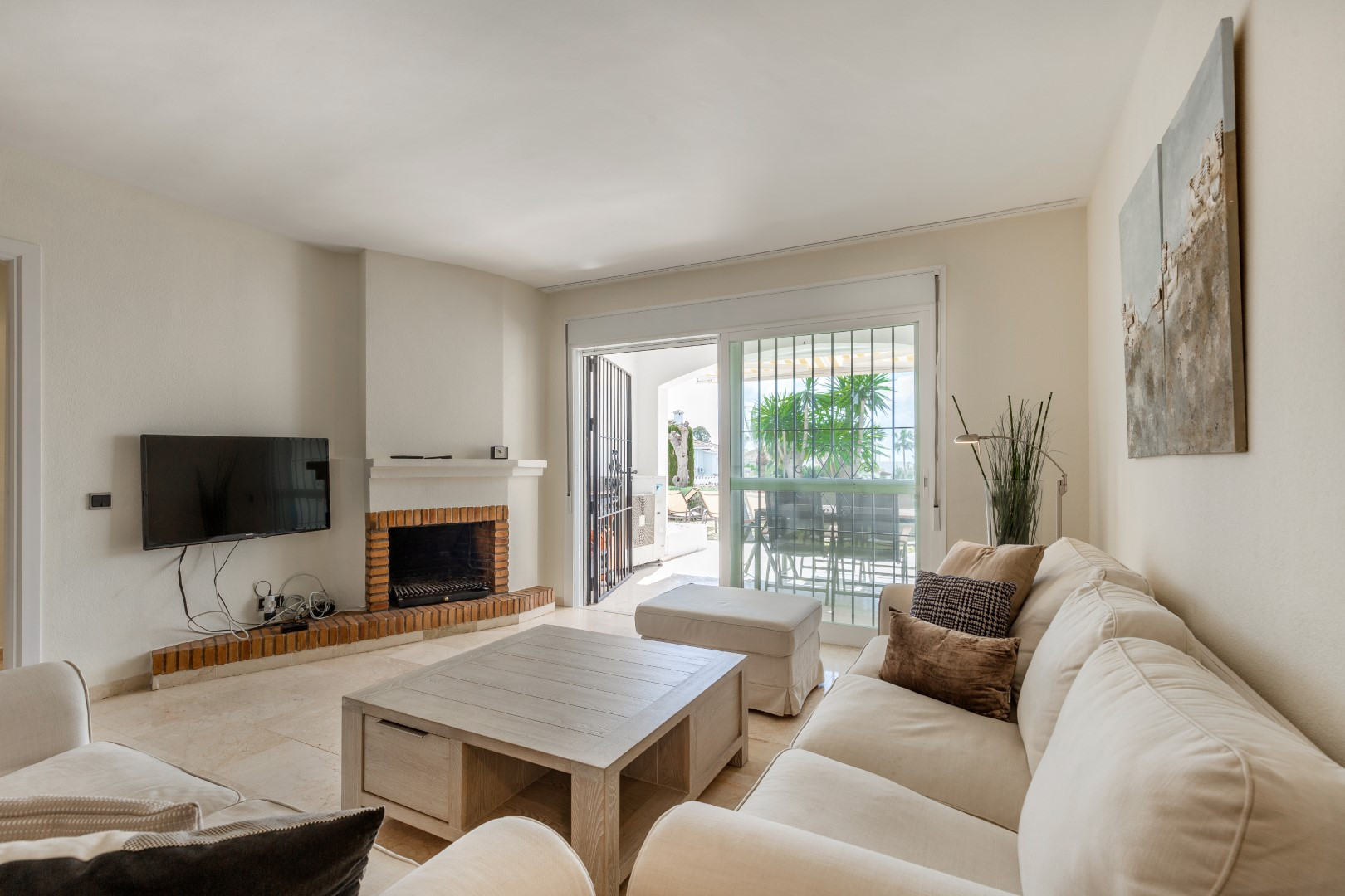 Combined living and dining room with comfortable sofa and TV area, leading out to the terrace.