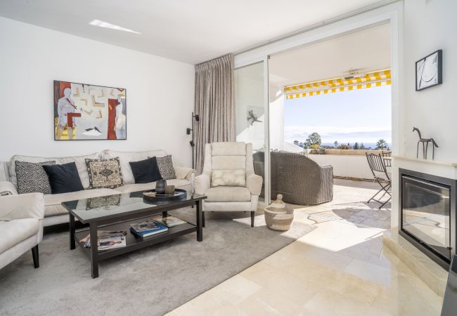 The apartment is ideal for a comfortable and relaxing stay in Nueva Andalucia. The open-plan layout includes a combined living and dining area that flows seamlessly into a fully equipped kitchen with a breakfast bar. The living room opens onto a wonderful terrace, complete with both lounging and dining areas, where you can enjoy breath-taking sea and mountain views thanks to its elevated position.
