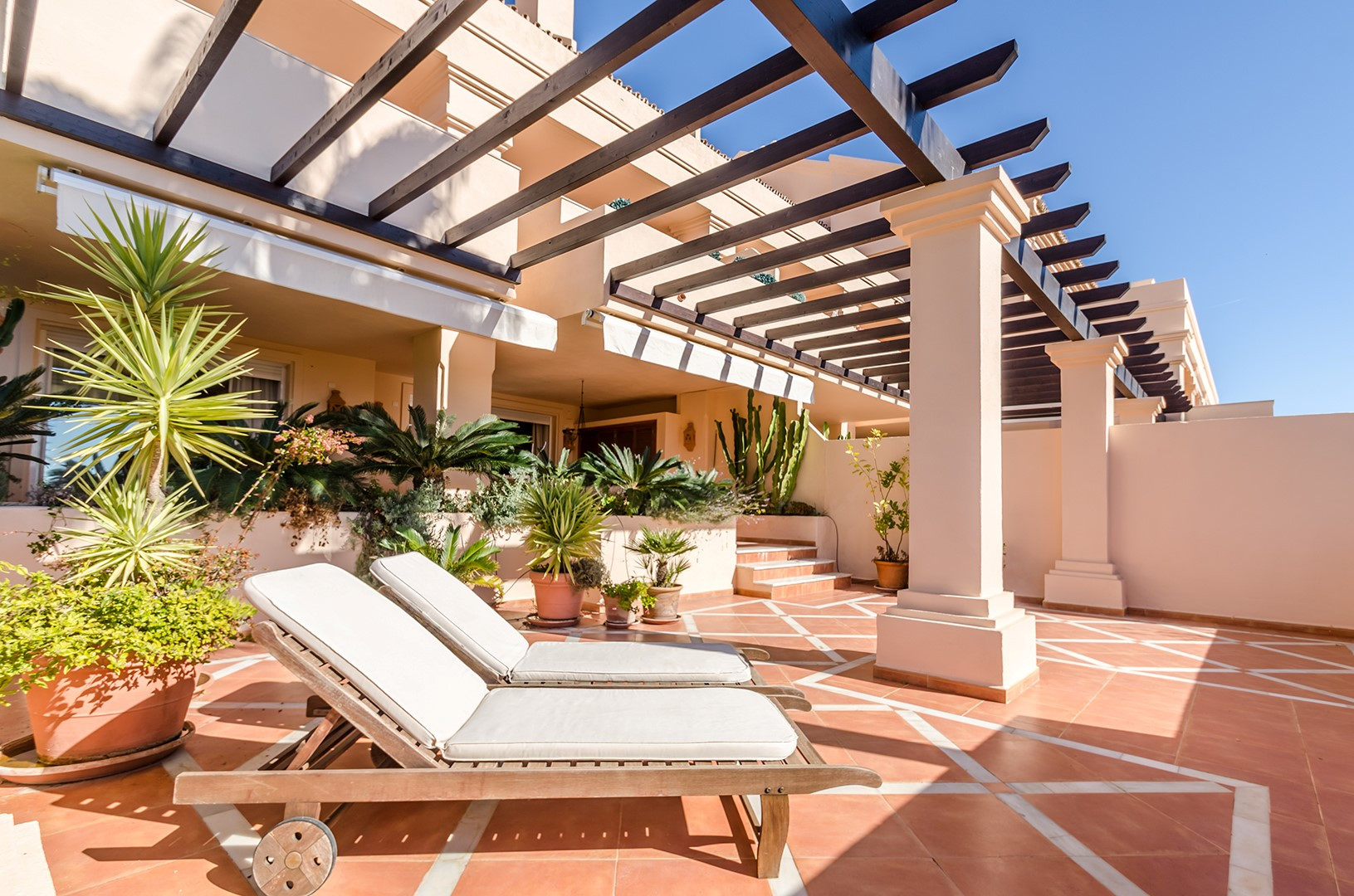 Two bedroom, ground floor apartment available for holiday rentals in an exclusive gated complex, set in the hills of Nueva Andalucia. Albatross Hills features beautiful swimming pool areas and a tennis court, as well as an indoor pool, gym and sauna.